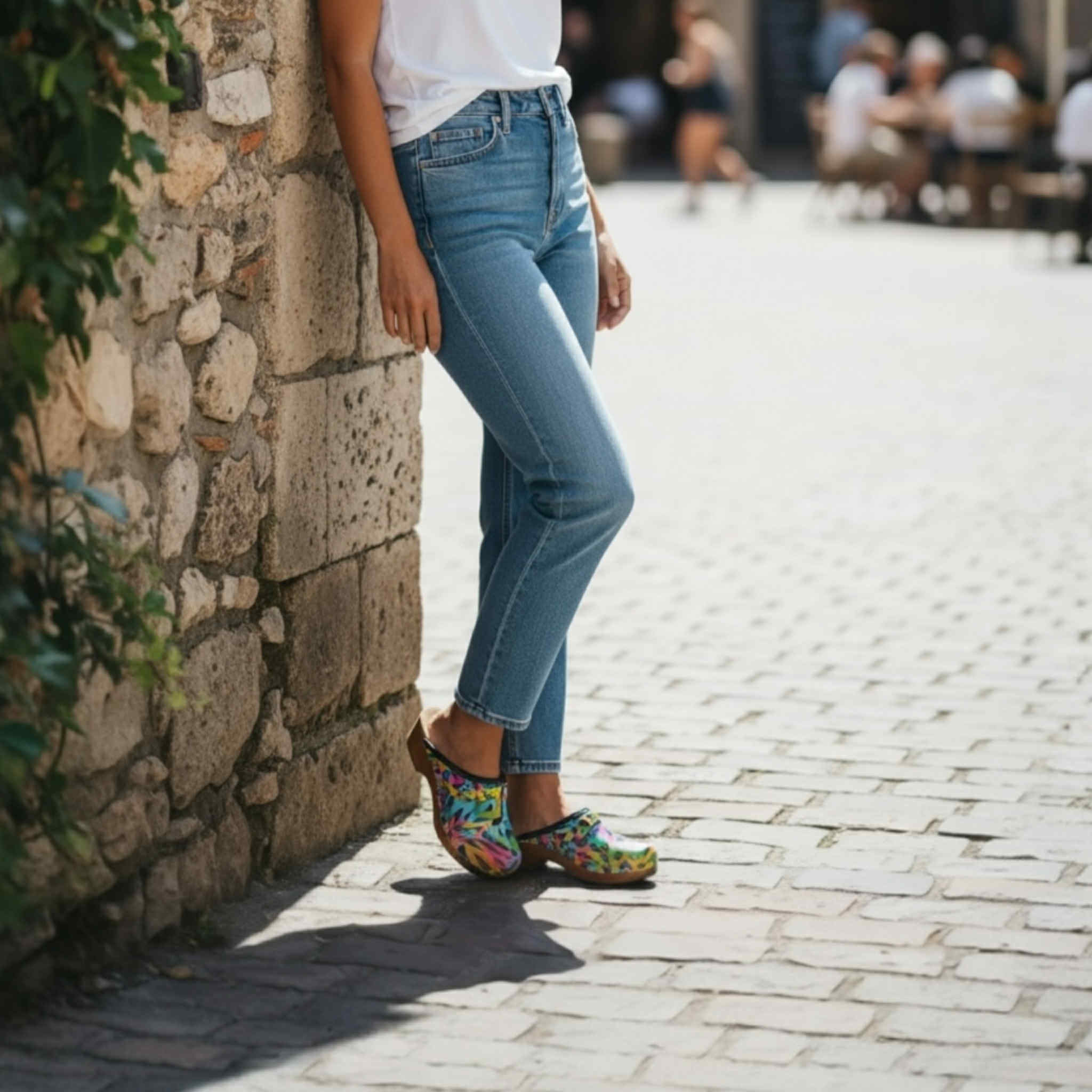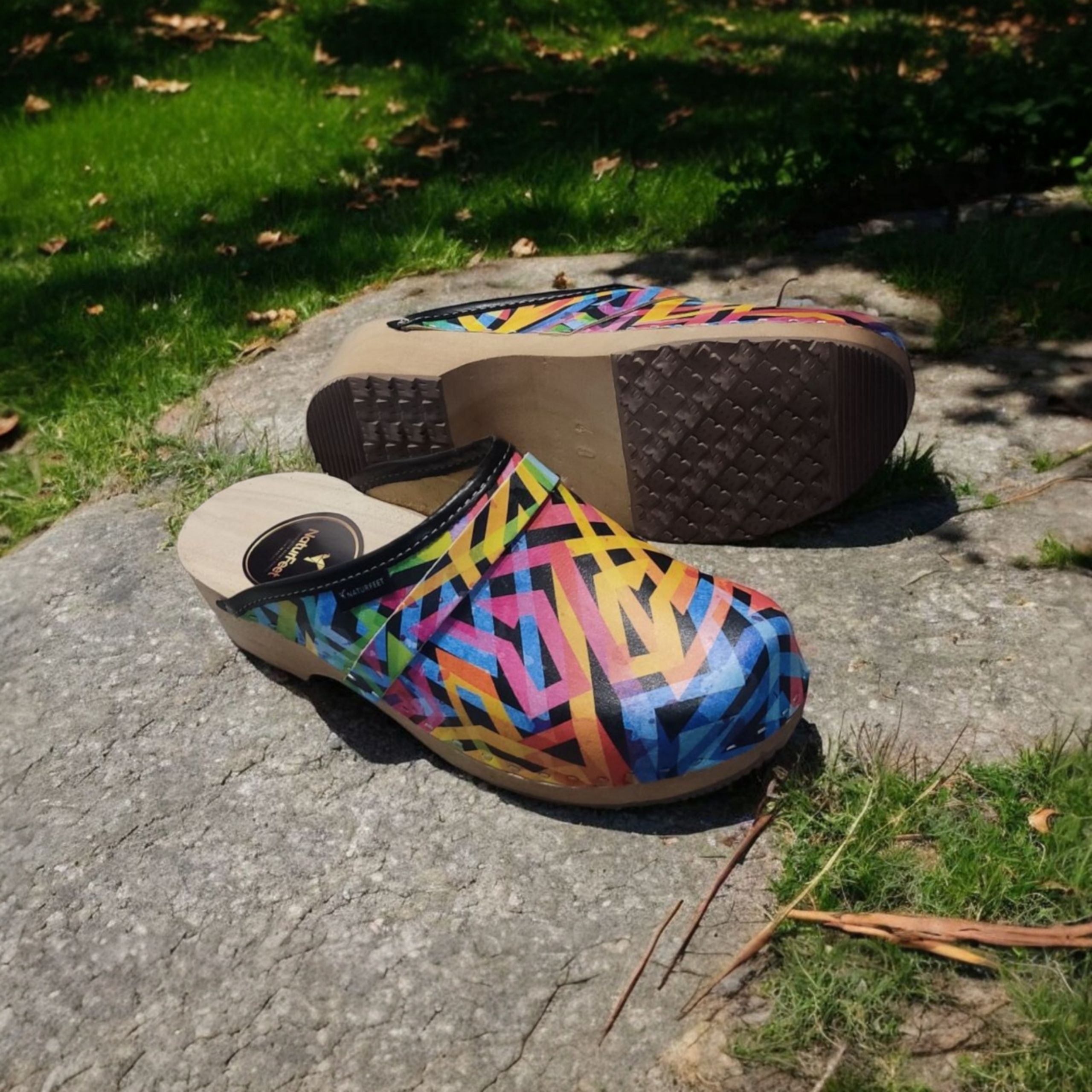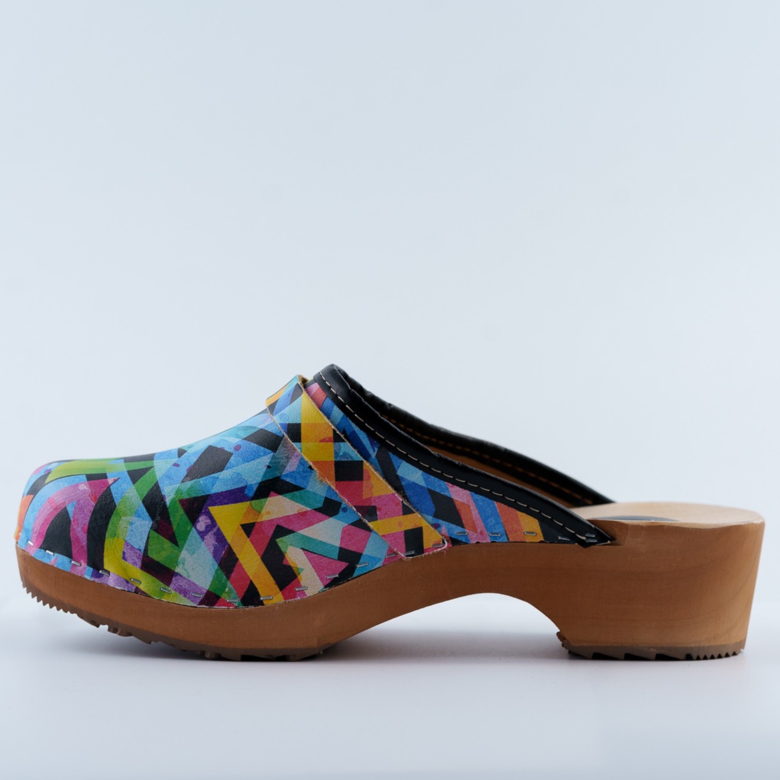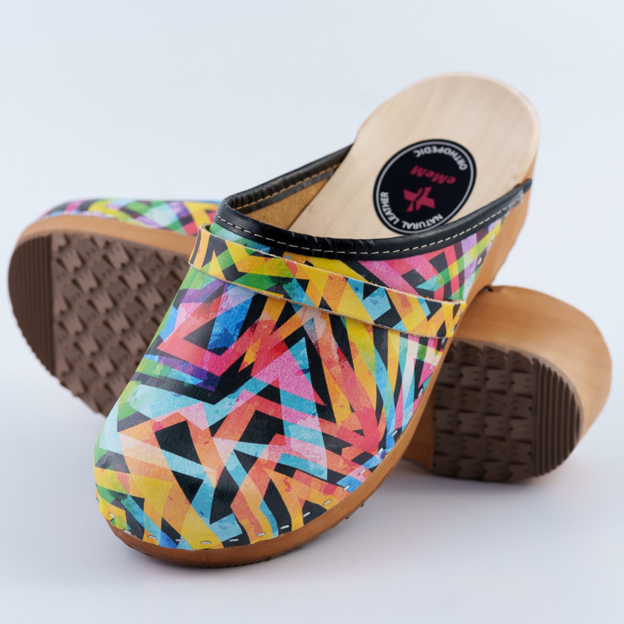 Artystyczne drewniaki Naturfeet DKC6PC przyciągają uwagę wielokolorowym, geometrycznym wzorem i klasyczną drewnianą podeszwą. To model dla osób, które lubią odważniejszy akcent, ale nadal chcą wygodnego, stabilnego fasonu na co dzień. Naturalna skóra, wsuwana konstrukcja i obcas 4,5 cm tworzą połączenie charakteru oraz komfortu.
