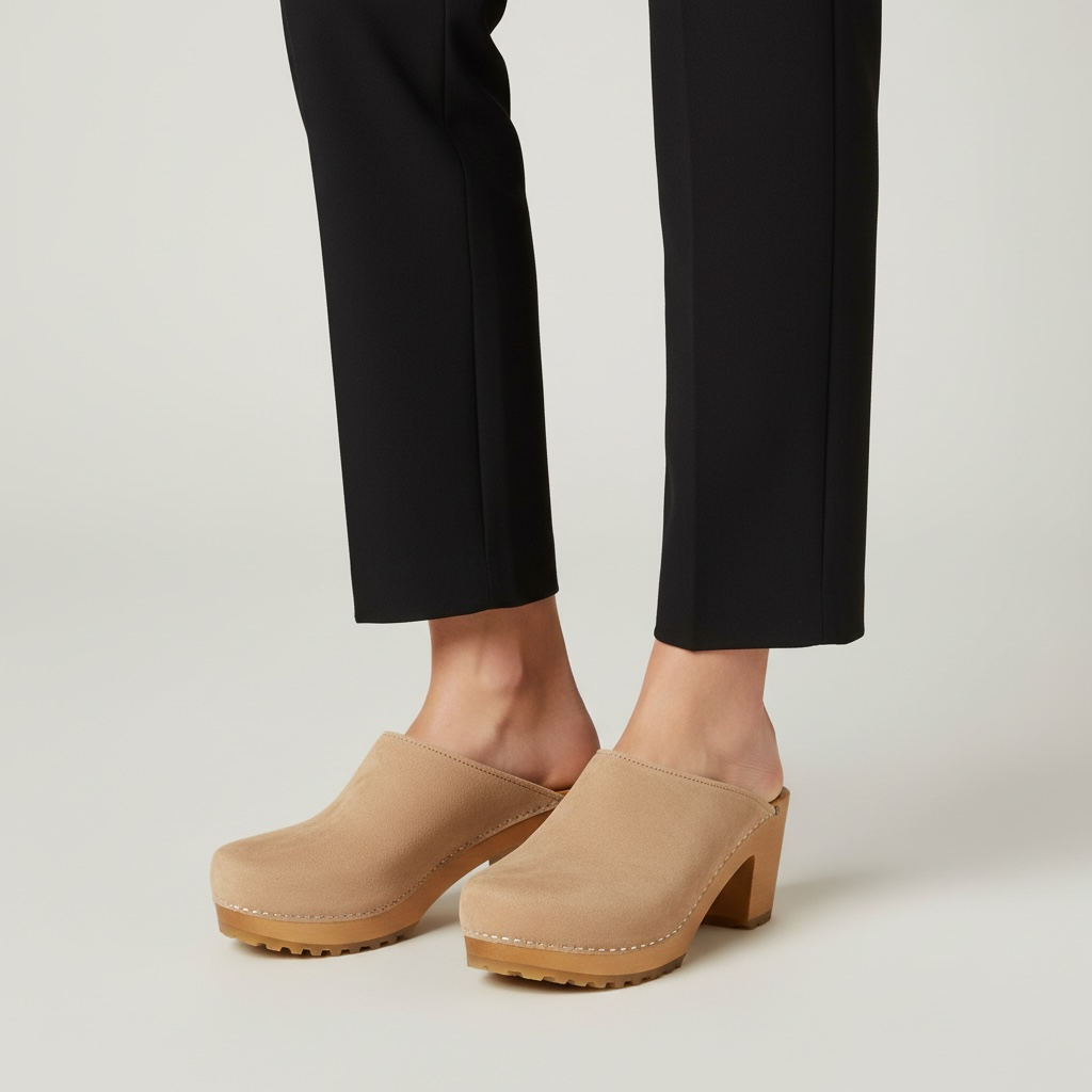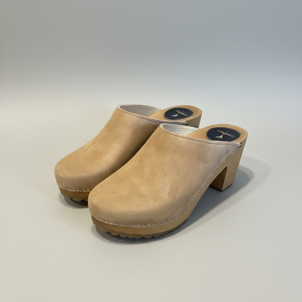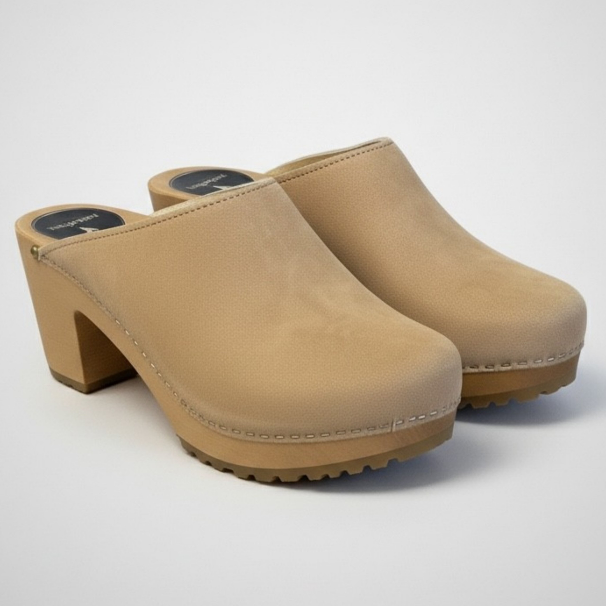 Damskie chodaki Naturfeet DH8BE to beżowy model z naturalnej skóry zamszowej osadzony na drewnianej podeszwie z olchy. Wyższy obcas 7,5 cm wysmukla sylwetkę, a zabudowany fason zachowuje wygodę potrzebną w codziennym użytkowaniu. To drewniaki w jasnej, spokojnej odsłonie, które łatwo połączyć z prostszymi stylizacjami.