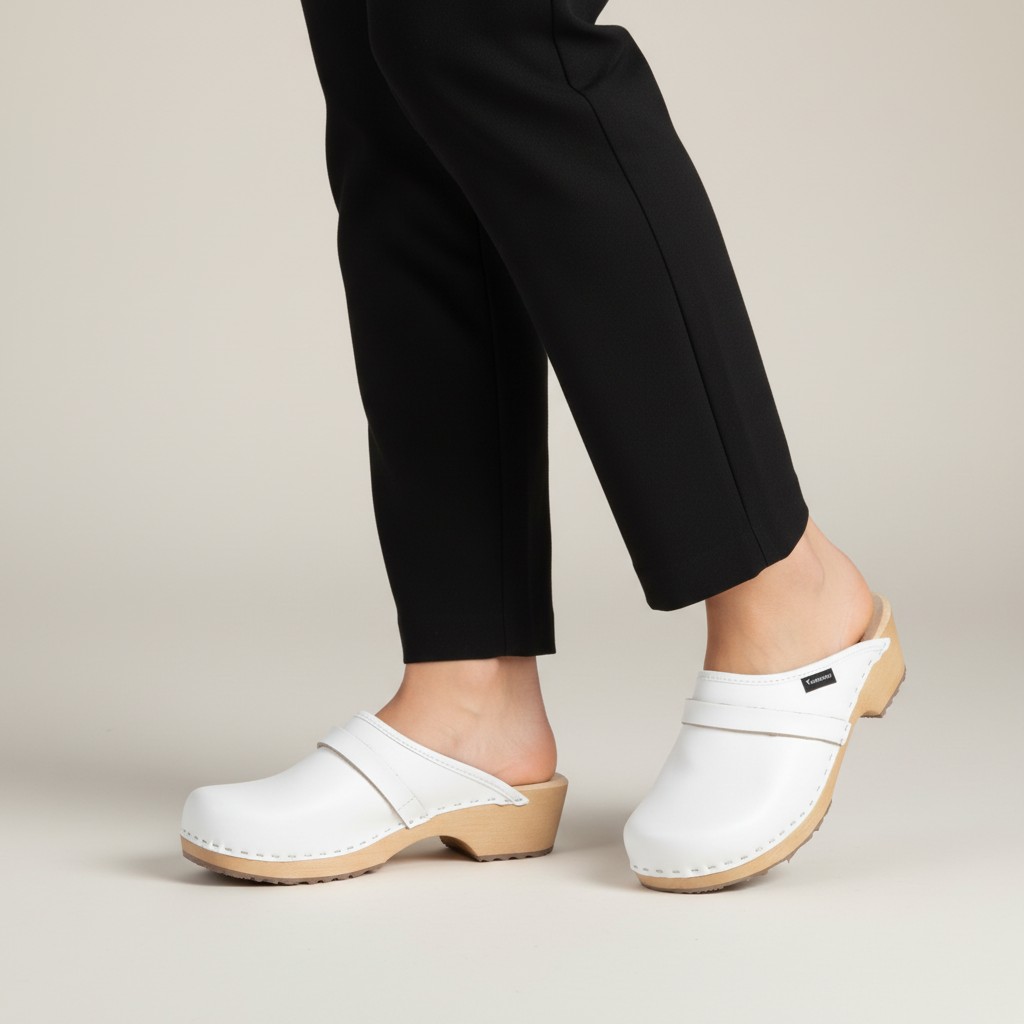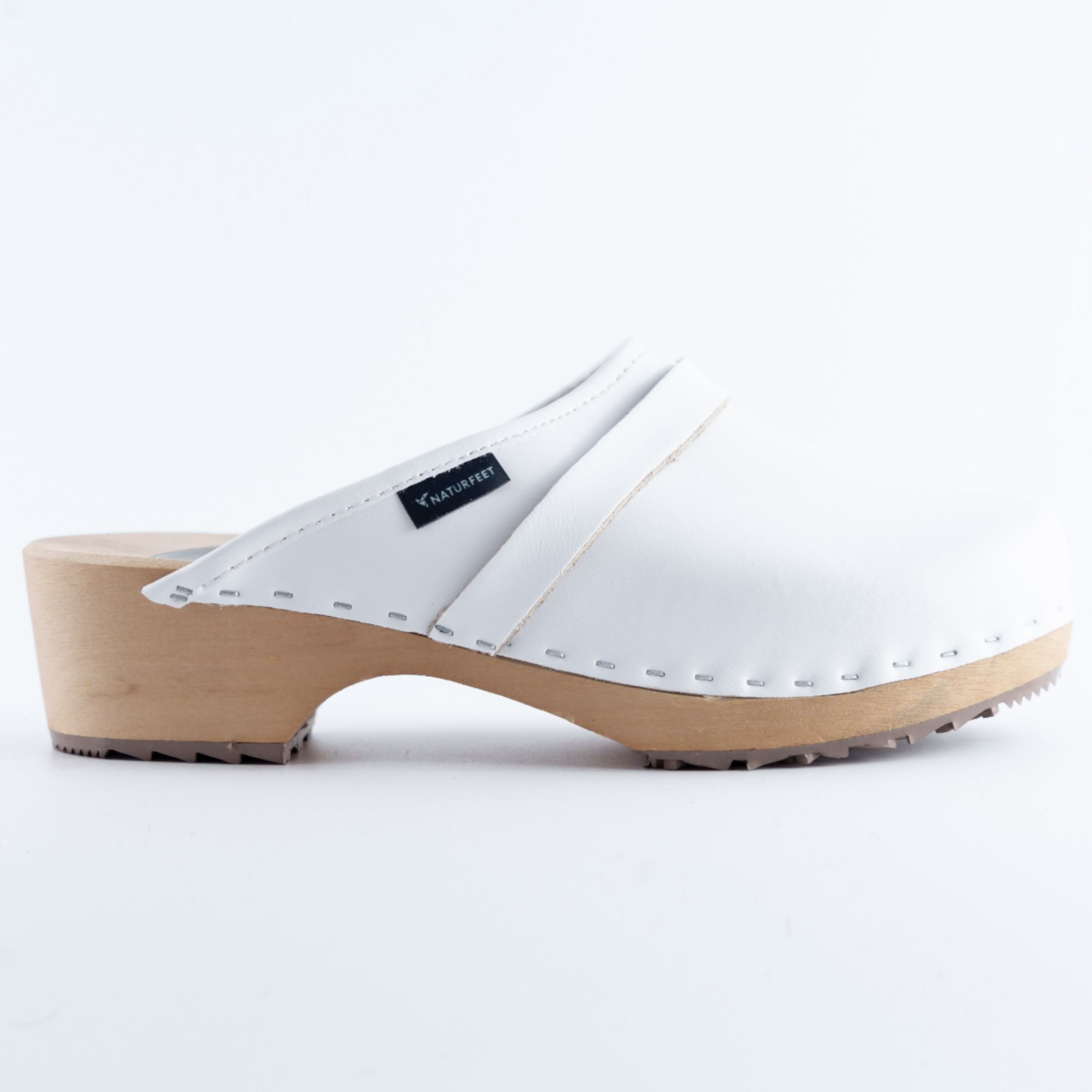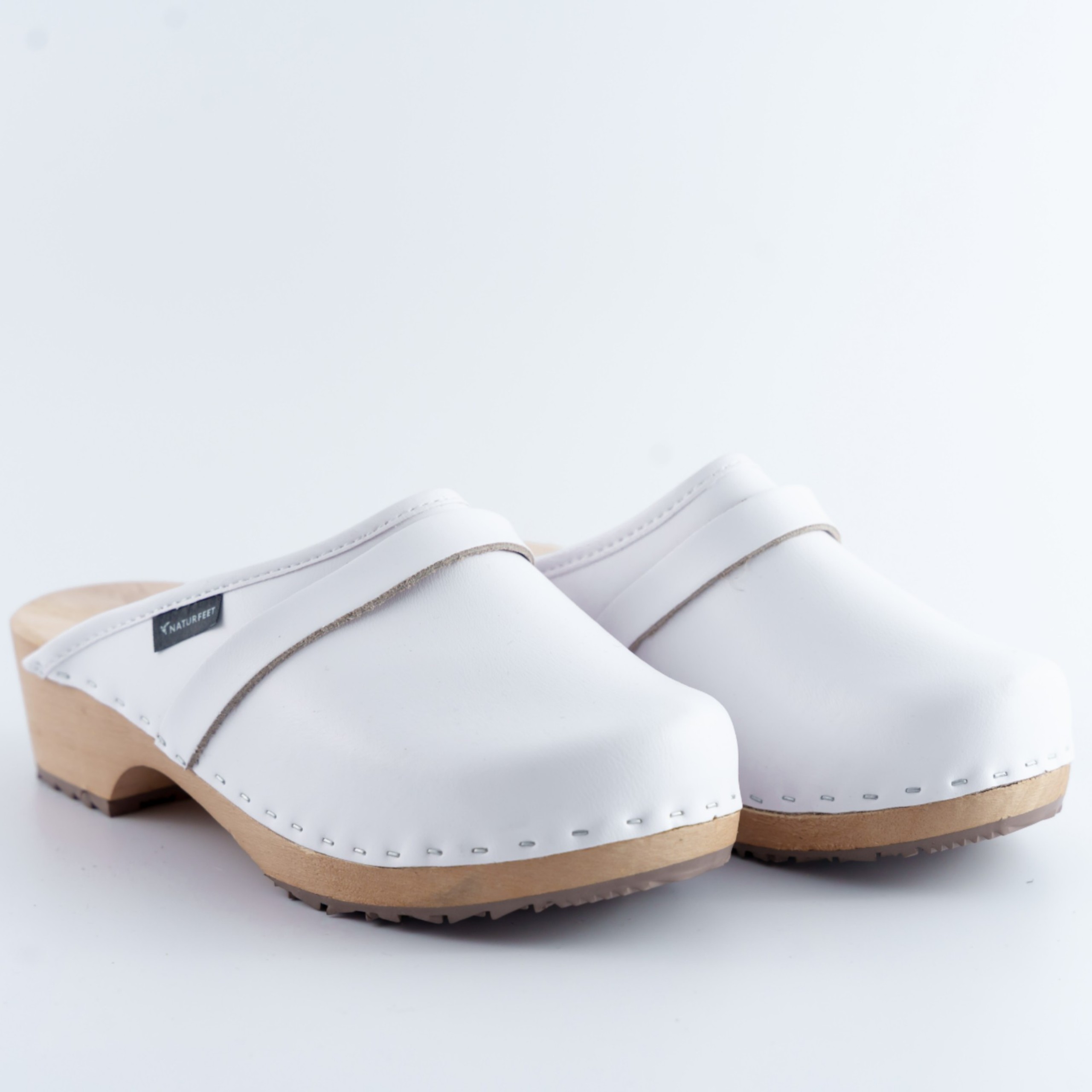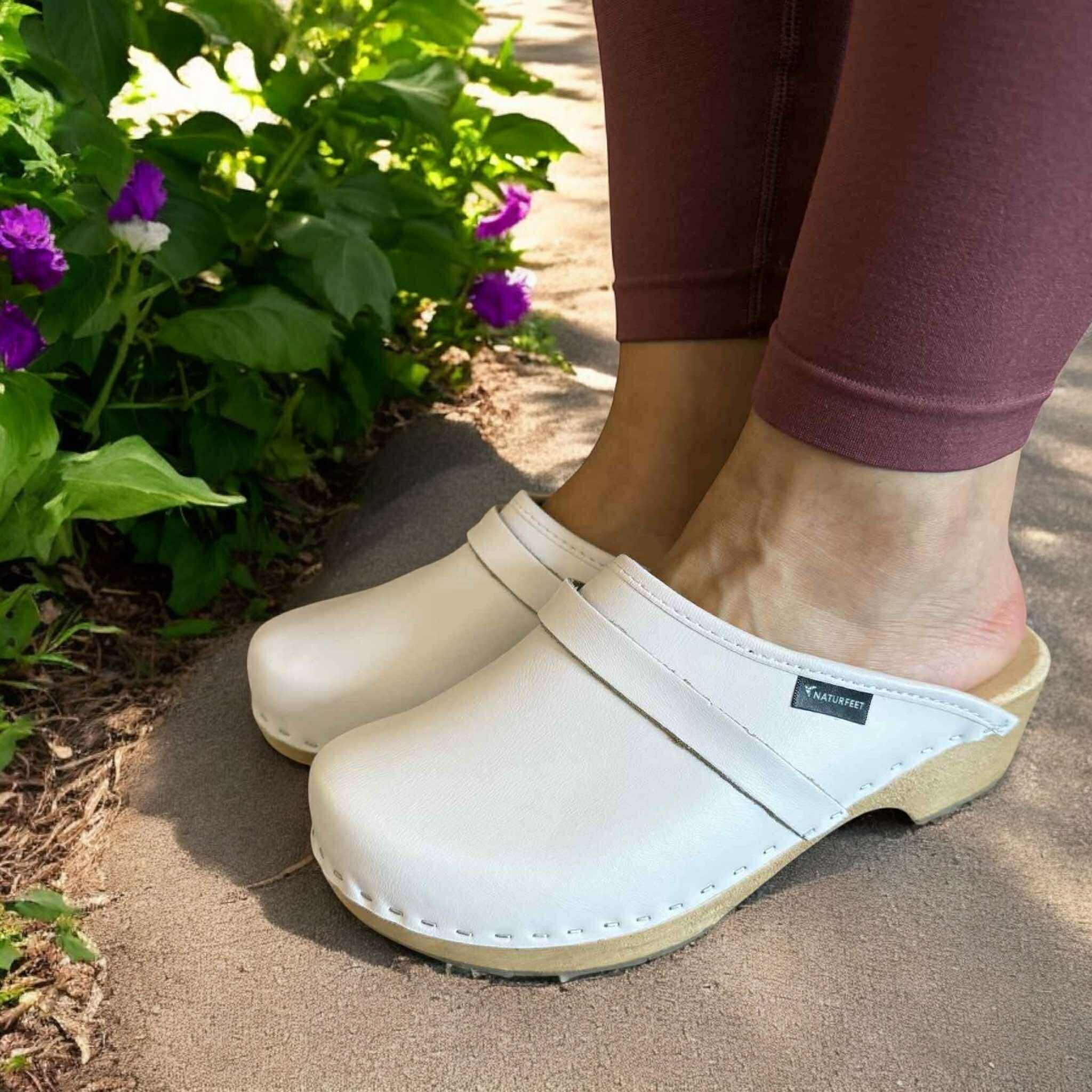 Stylowe i wygodne chodaki marki Naturfeet to połączenie klasycznego designu i najwyższej jakości materiałów. Wykonane z naturalnej skóry w eleganckim białym kolorze, idealnie sprawdzą się zarówno do pracy, jak i na co dzień. Stabilny, drewniany obcas o wysokości 4,5 cm zapewnia komfort przez cały dzień, a antypoślizgowa podeszwa zwiększa bezpieczeństwo użytkowania. Naturalne materiały gwarantują odpowiednią wentylację i trwałość obuwia.