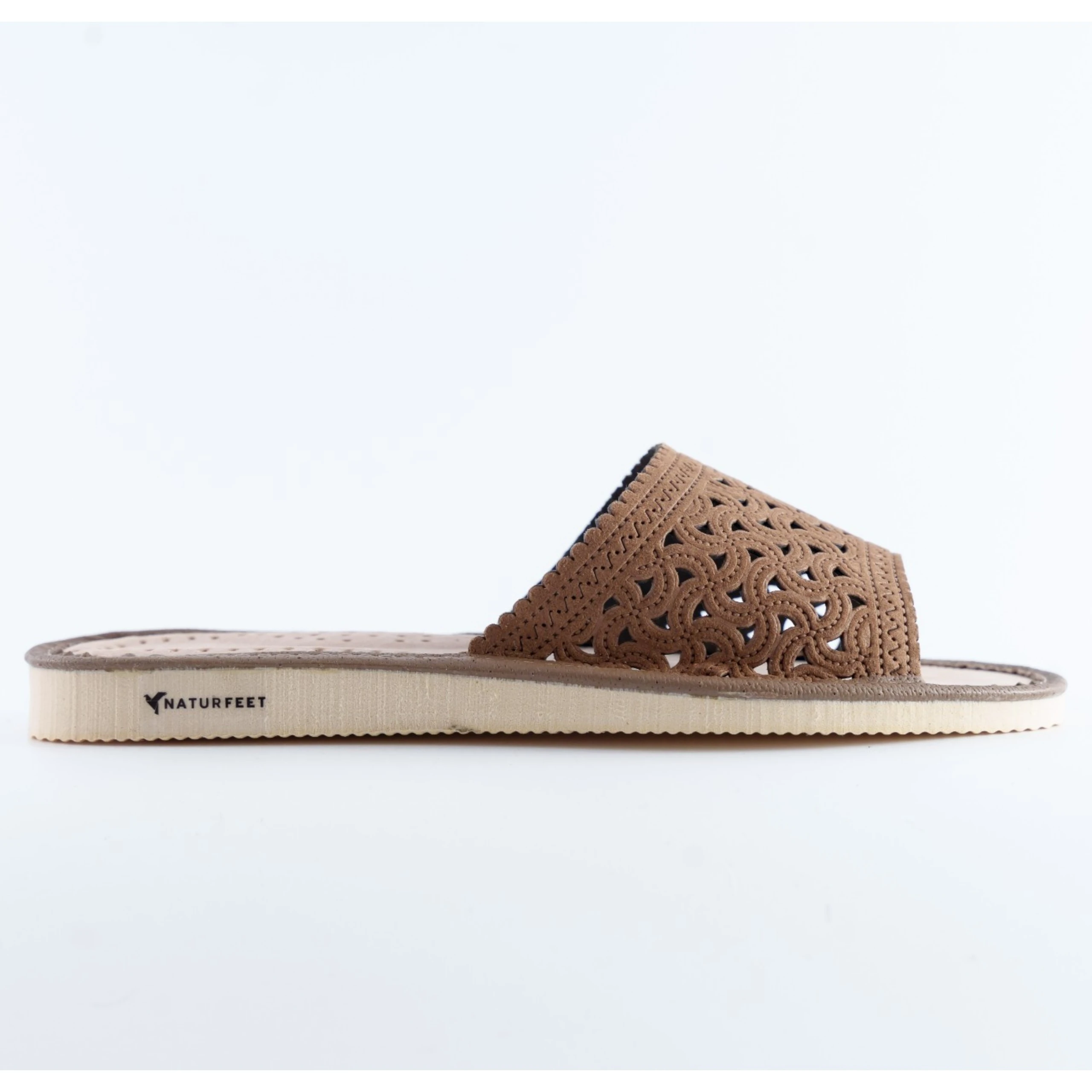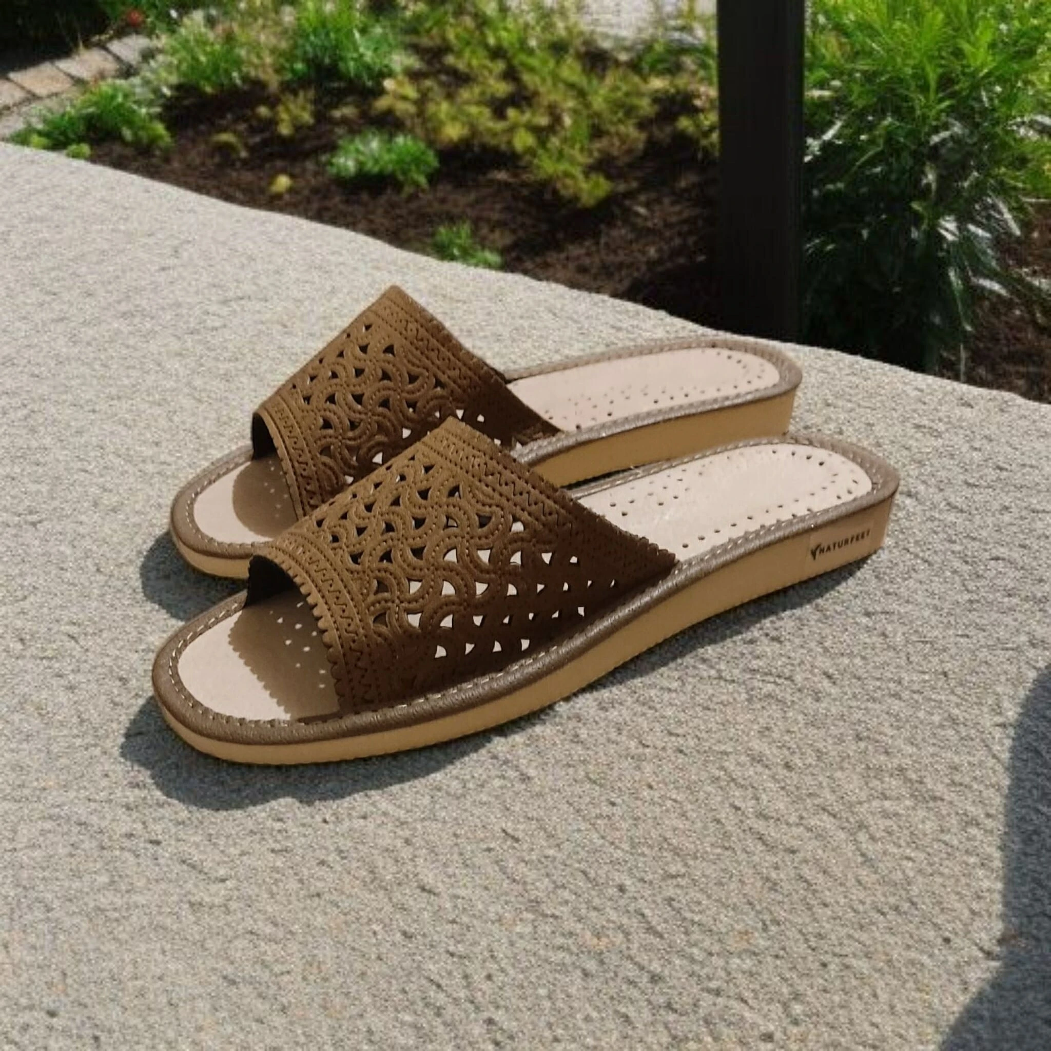 Stylowe i oddychające damskie kapcie marki Naturfeet, wykonane w całości z wysokiej jakości naturalnej skóry. Ażurowy wzór w części wierzchniej nadaje im lekkości i elegancji, a zarazem zapewnia świetną cyrkulację powietrza – idealne na każdą porę roku.
