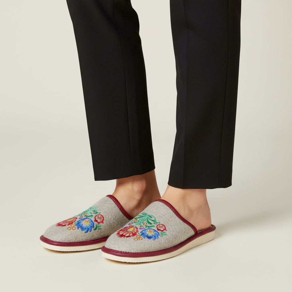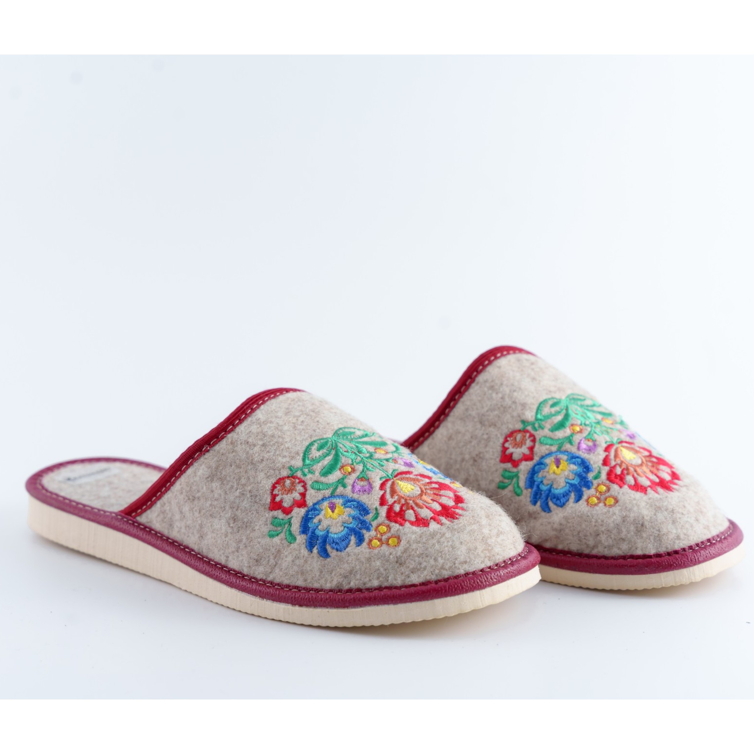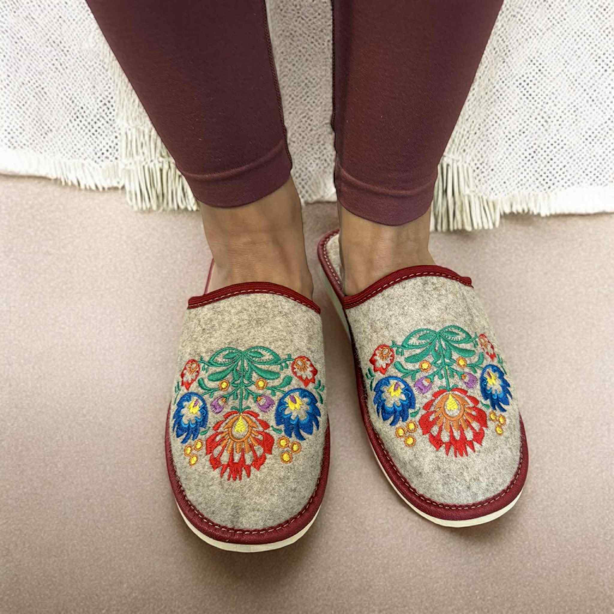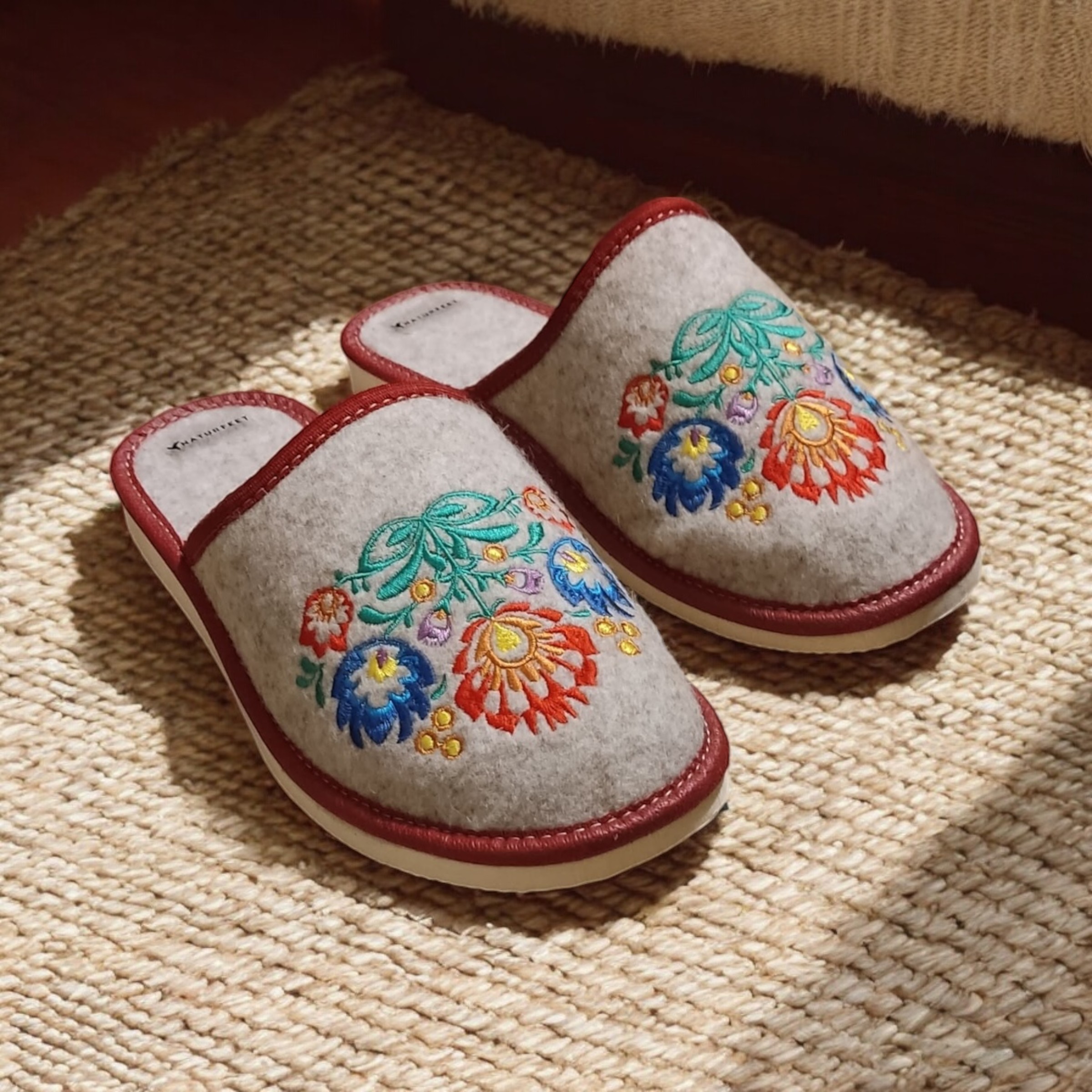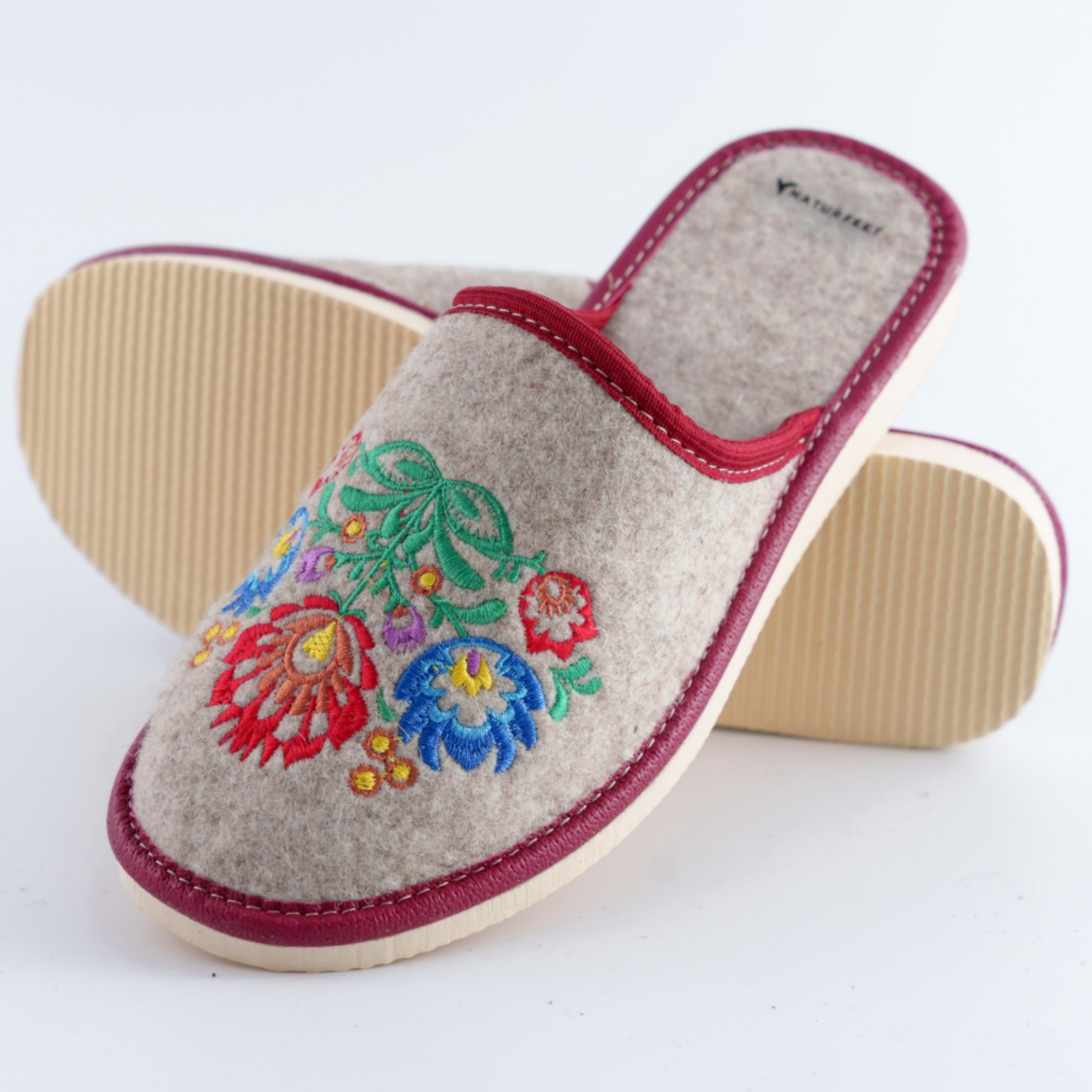 Postaw na ciepło, wygodę i ludowy akcent! Damskie kapcie marki Naturfeet wykonane z naturalnego filcu wełnianego to idealny wybór na chłodne dni. Ich miękka konstrukcja doskonale izoluje ciepło, a bogaty, kolorowy haft kwiatowy nadaje im unikalny, folkowy charakter.