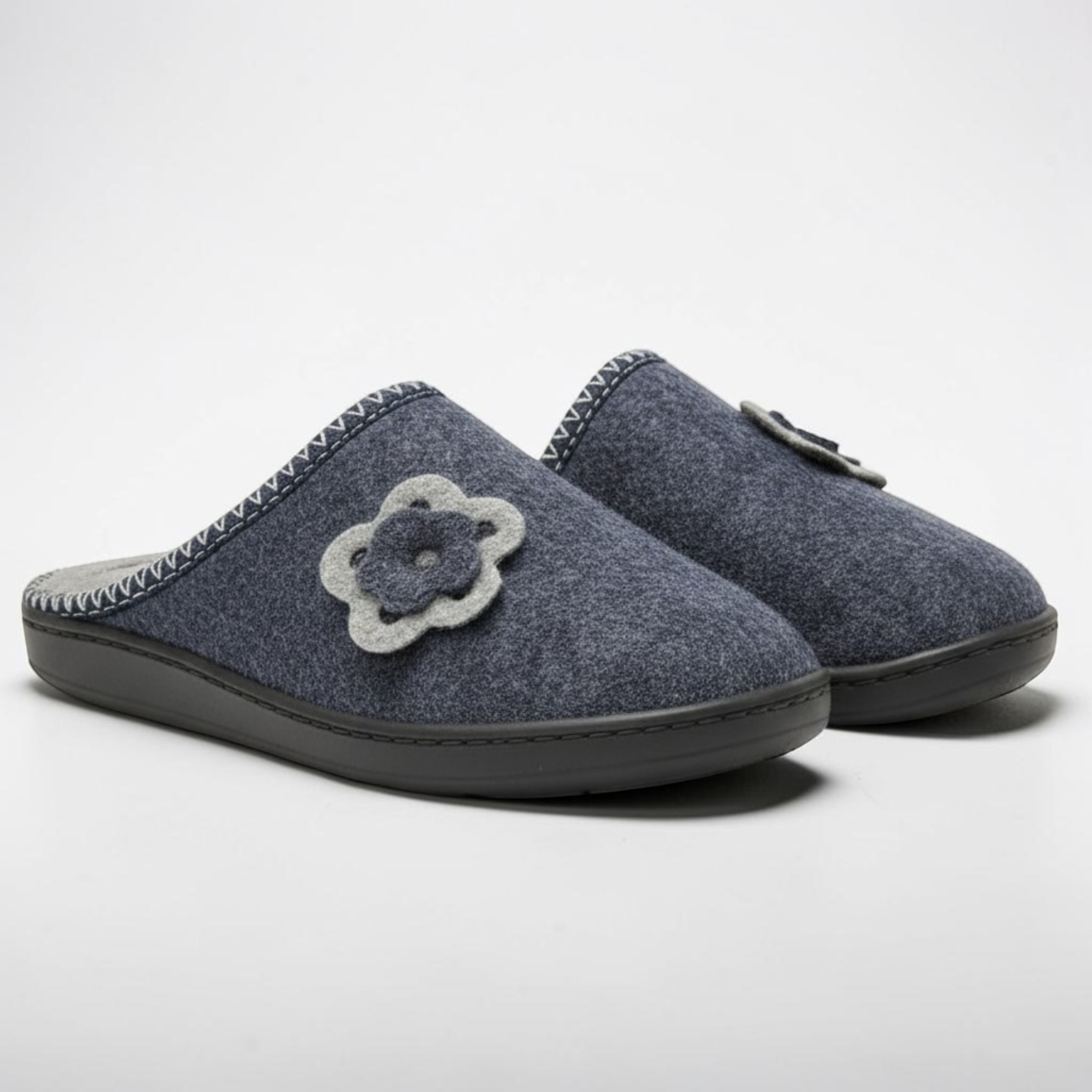 Cholewkę zdobi uroczy kwiatowy detal, a kontrastowe obszycie dodaje całości eleganckiego wykończenia. Antypoślizgowa podeszwa z wysokogatunkowego tworzywa gwarantuje komfort i bezpieczeństwo poruszania się po domu.