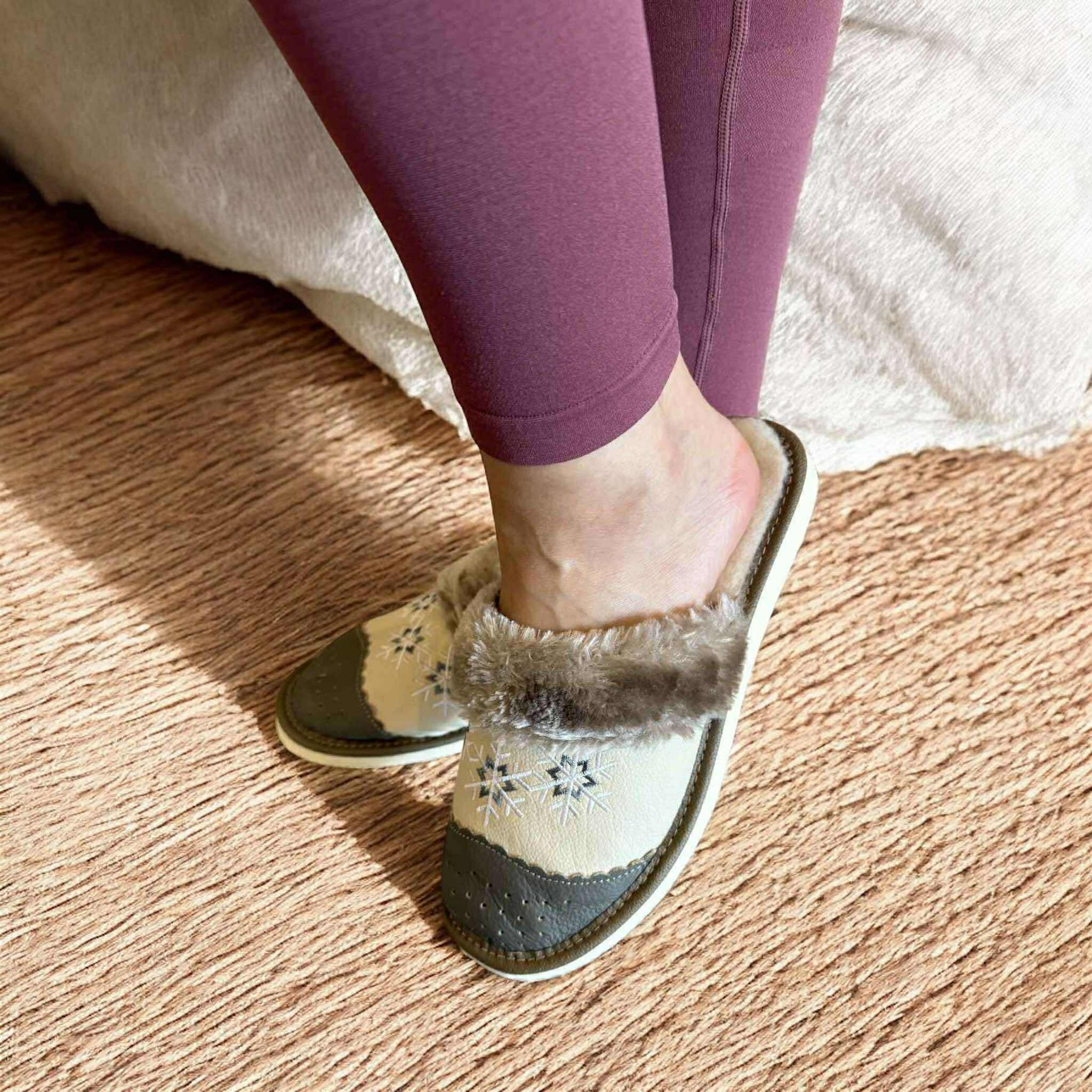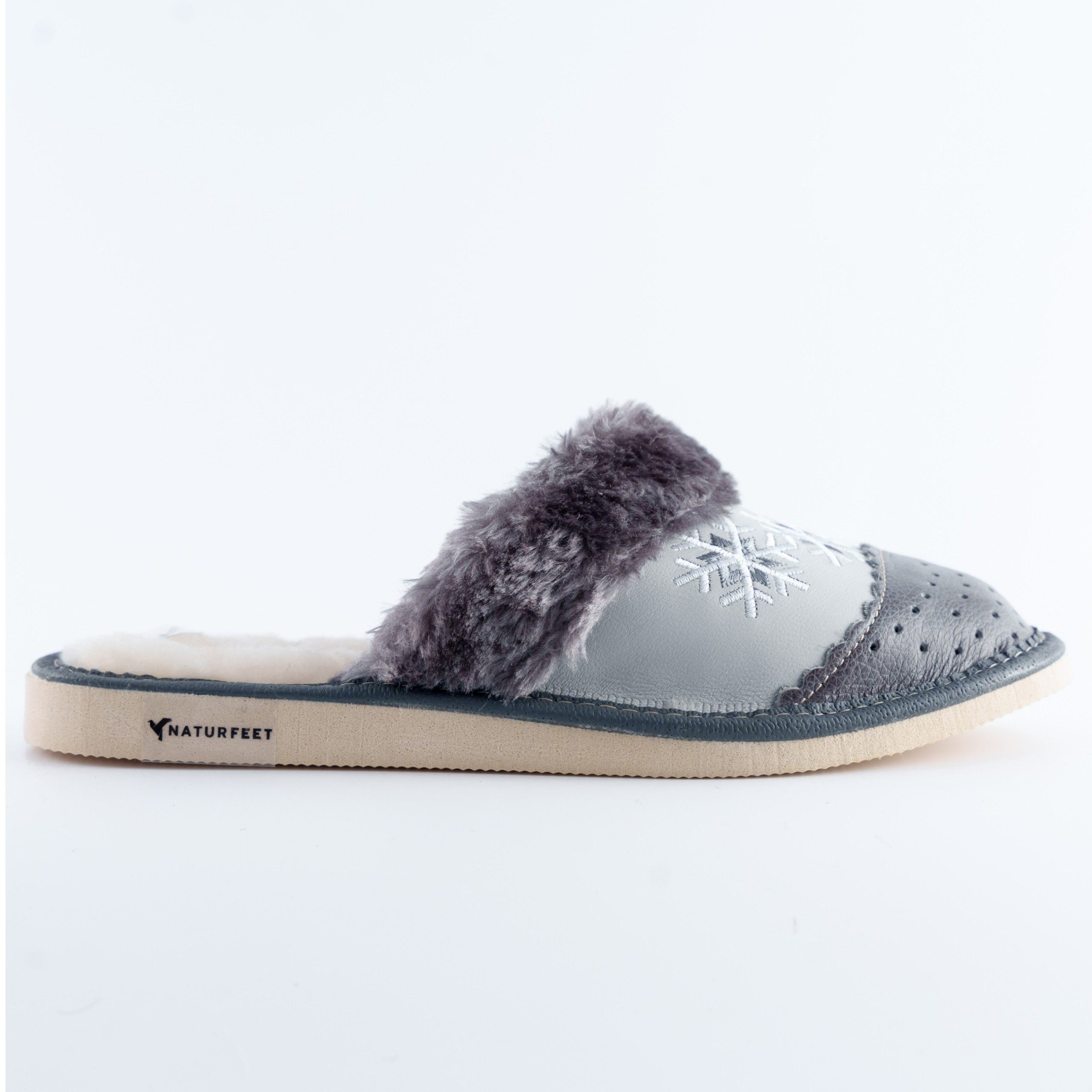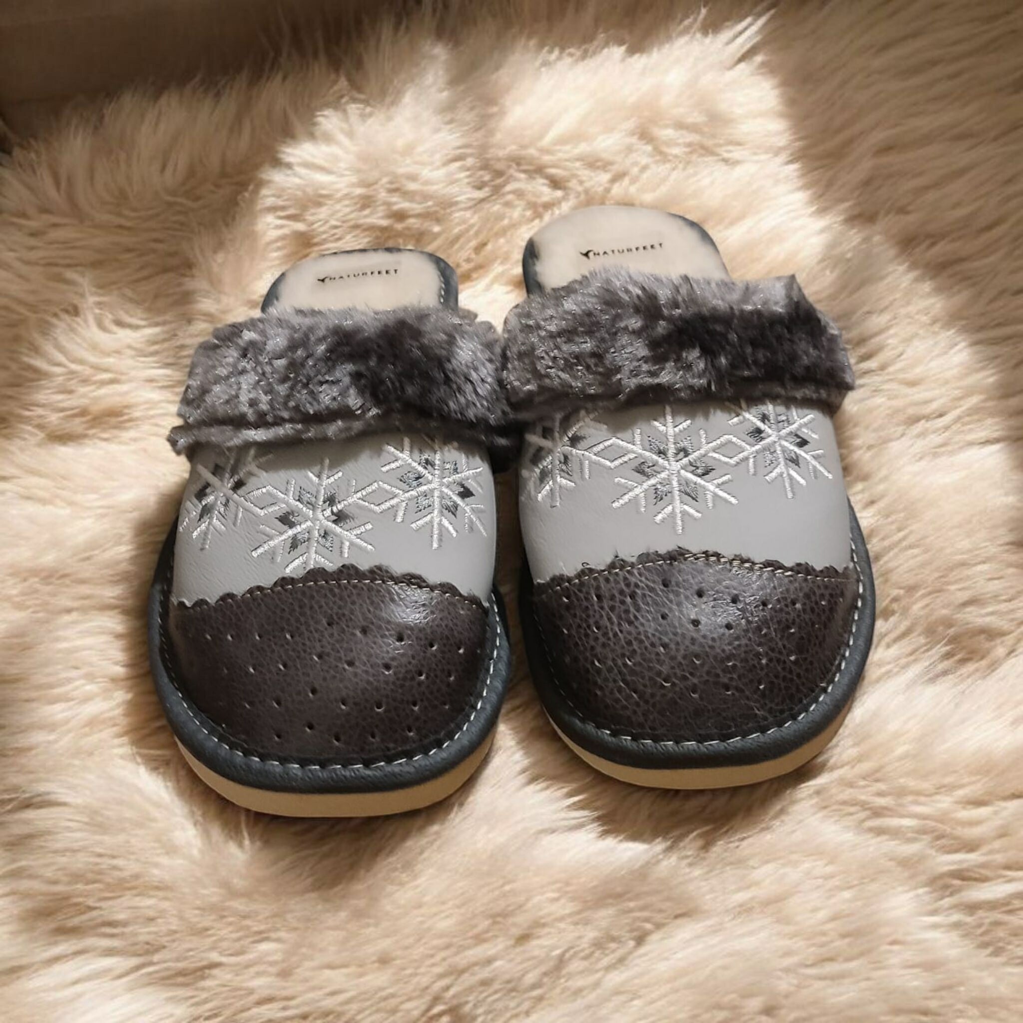 Wprowadź do swojego domu odrobinę zimowej magii z damskimi kapciami Naturfeet. Stylowy, zimowy haft w formie śnieżynek i puszyste futerko nadają im wyjątkowego charakteru. Wykonane z powlekanej skóry naturalnej, są trwałe i łatwe w czyszczeniu, a wnętrze w całości wyściełane miękkim futerkiem otula stopy ciepłem i wygodą.
