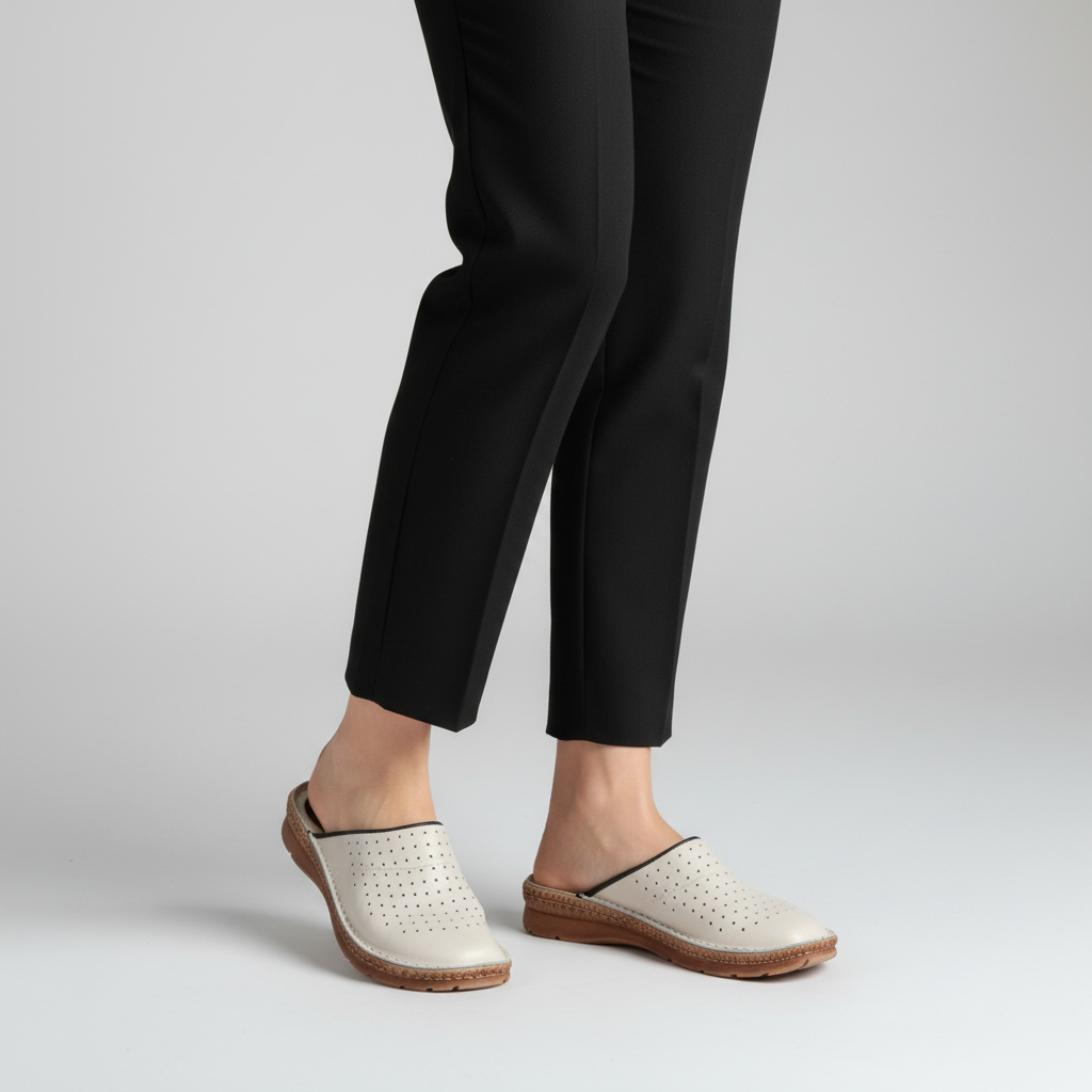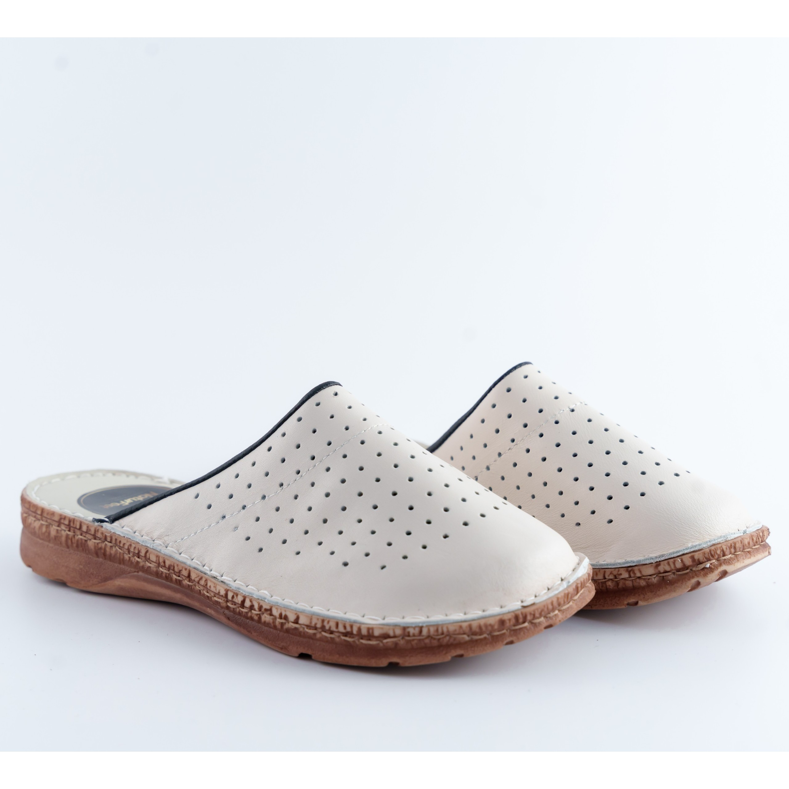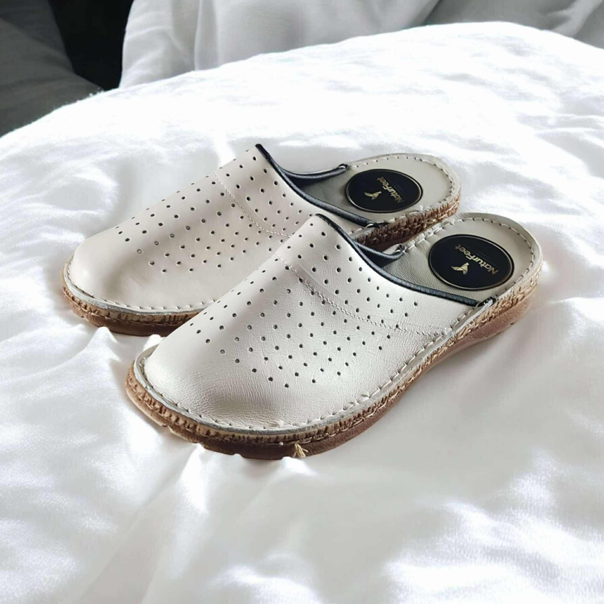 Damskie klapki Naturfeet KKC2BE to beżowy model ze skóry naturalnej, zaprojektowany z myślą o codziennym komforcie. Perforowana cholewka wspiera przewiewność, a miękka, profilowana wkładka pomaga stopie odpocząć podczas chodzenia w domu i poza nim. To lekki, prosty fason dla osób, które lubią naturalne materiały i spokojny wygląd.