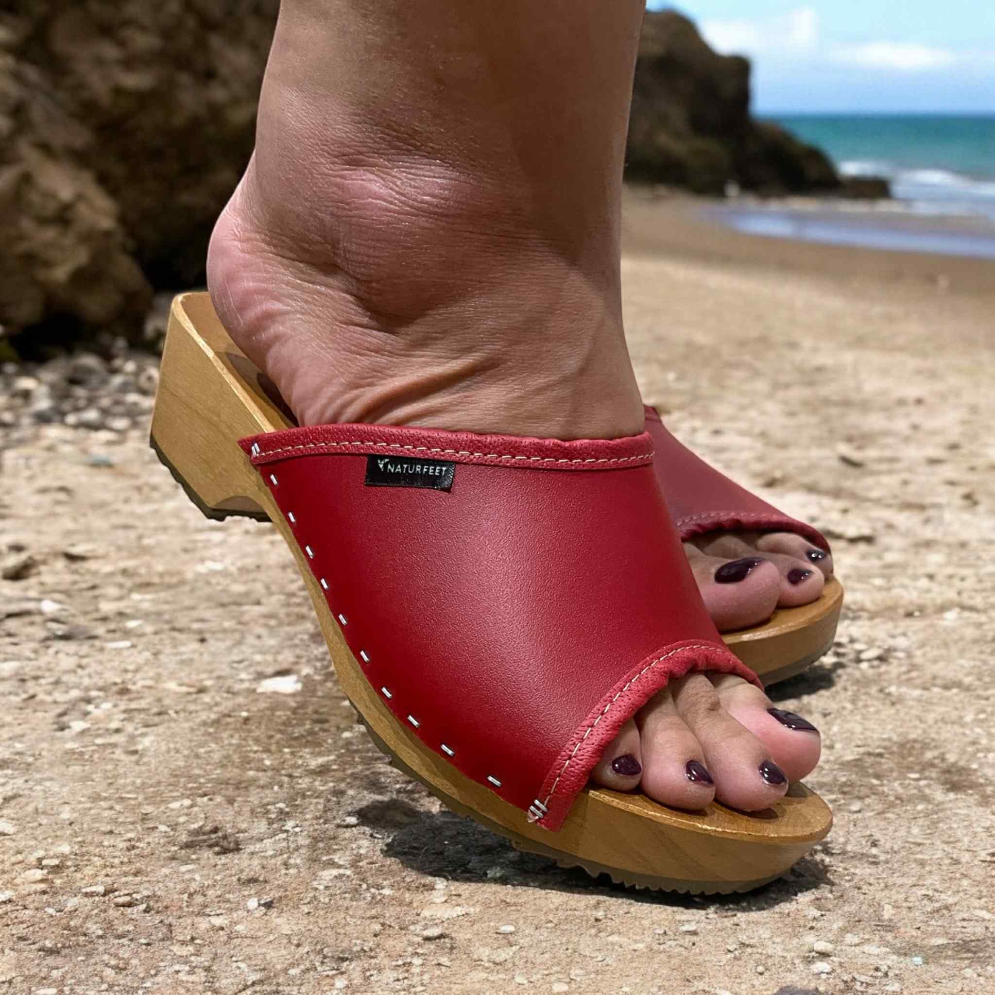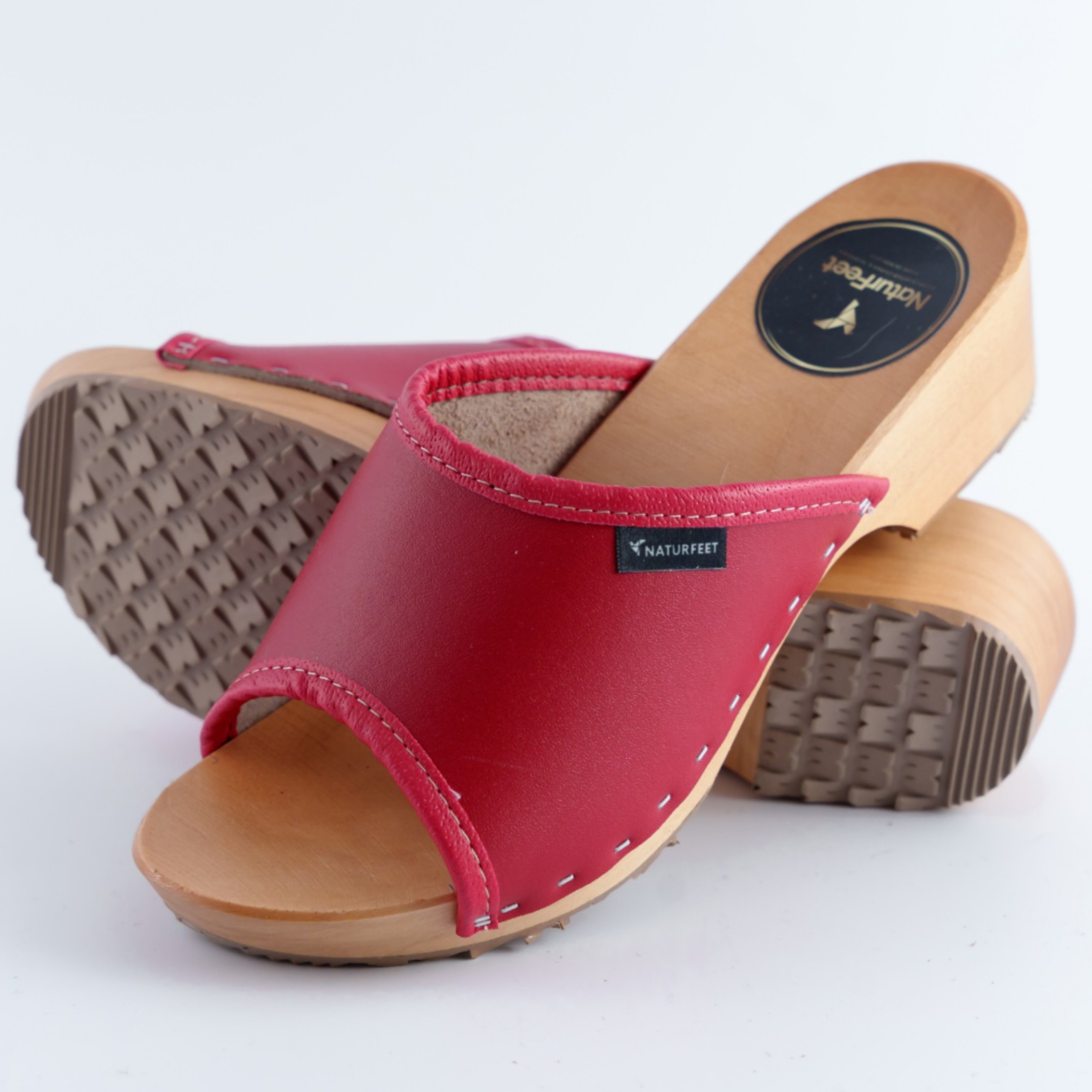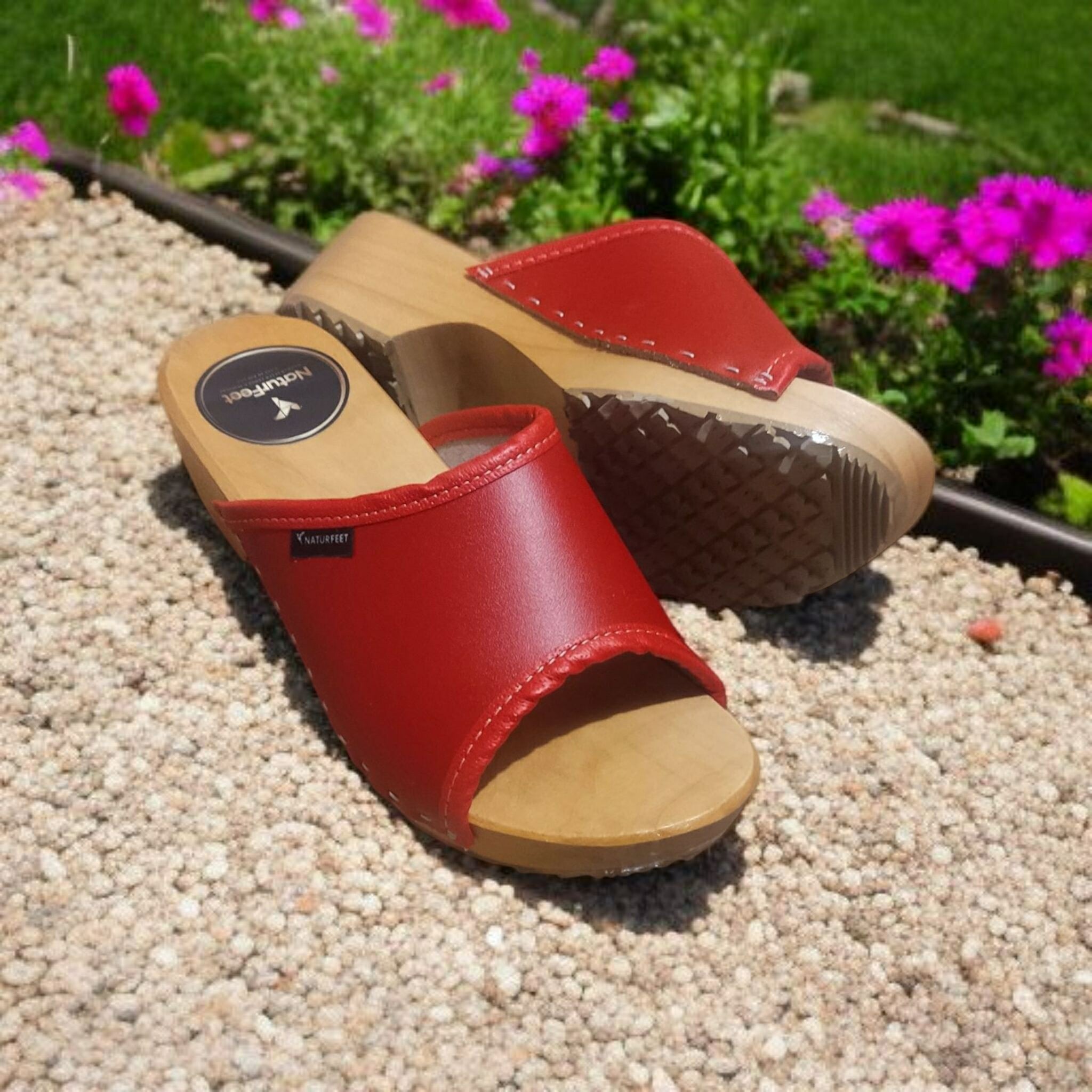 Postaw na naturalny komfort i ponadczasowy styl z damskimi drewniakami Naturfeet. Te eleganckie klapki zostały wykonane z wysokiej jakości naturalnej skóry w klasycznym czerwonym kolorze. Solidna, profilowana podeszwa z drewna zapewnia odpowiednie podparcie dla stóp, a antypoślizgowy bieżnik gwarantuje stabilność na różnych nawierzchniach. Idealne zarówno do codziennego użytku, jak i do pracy – szczególnie w branży medycznej czy kosmetycznej.