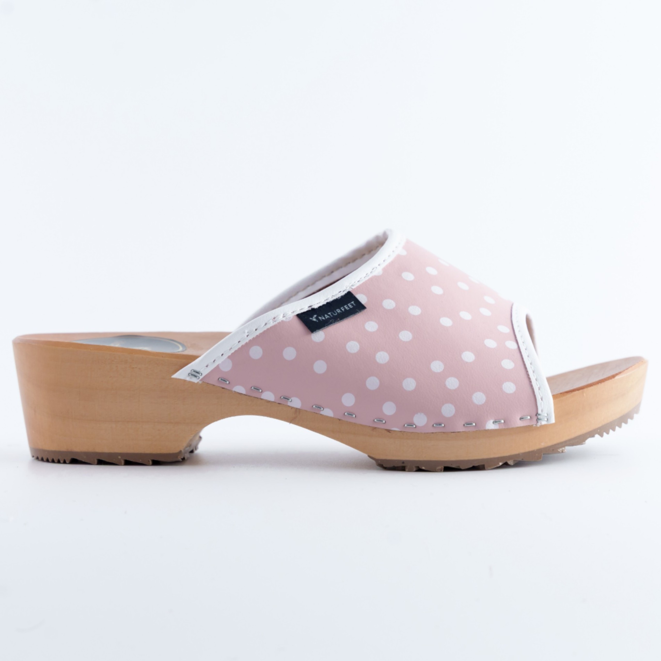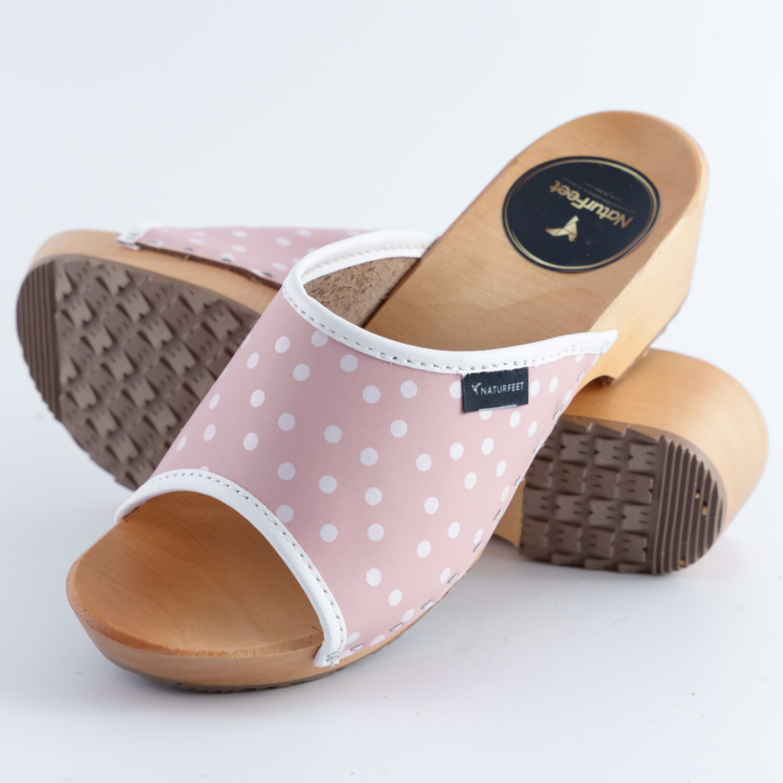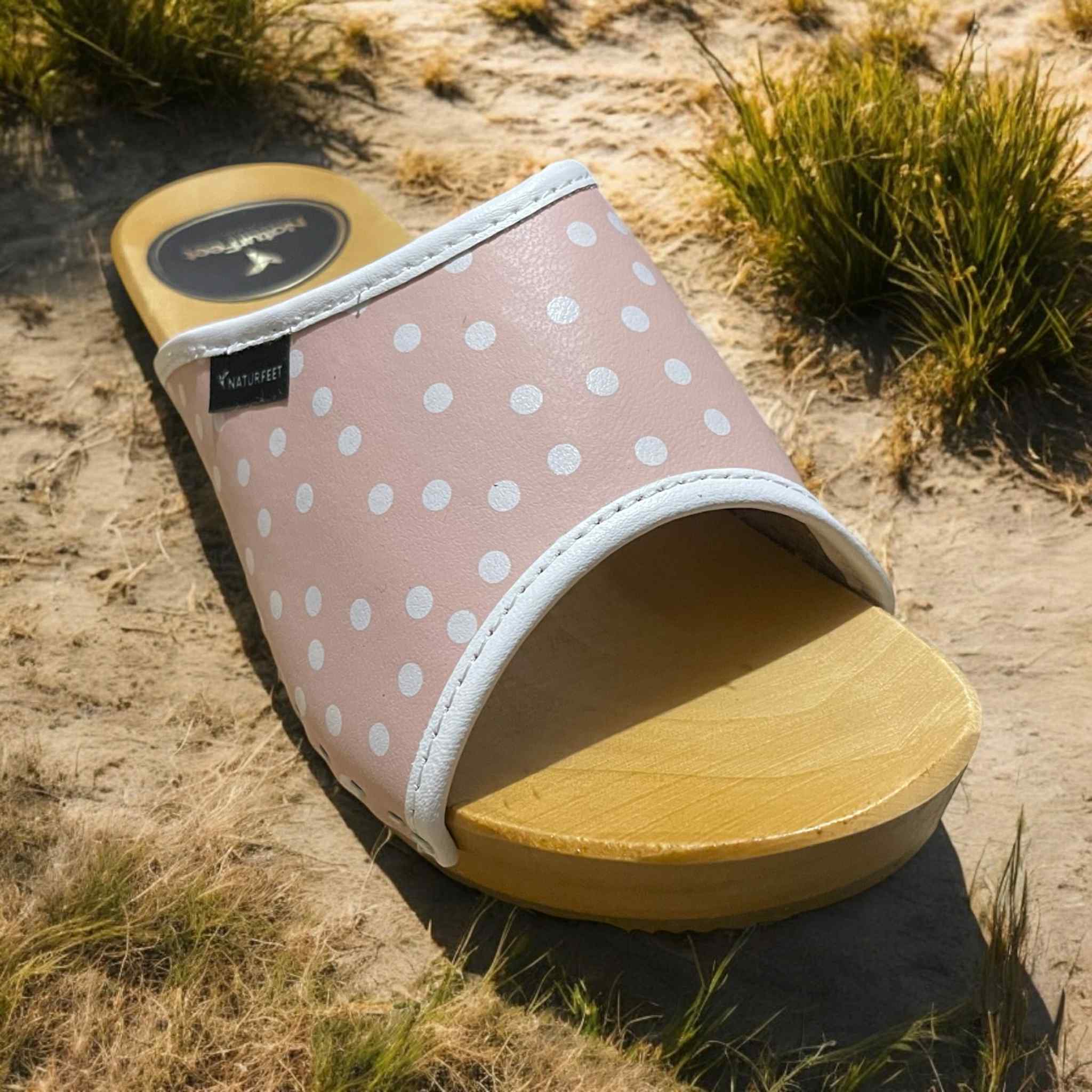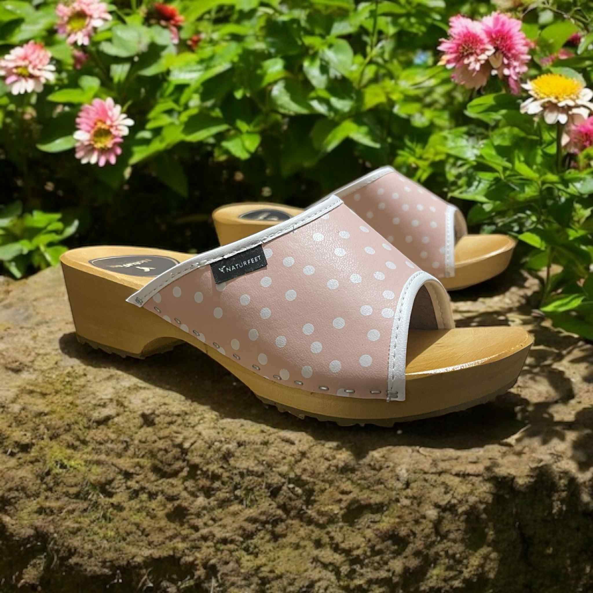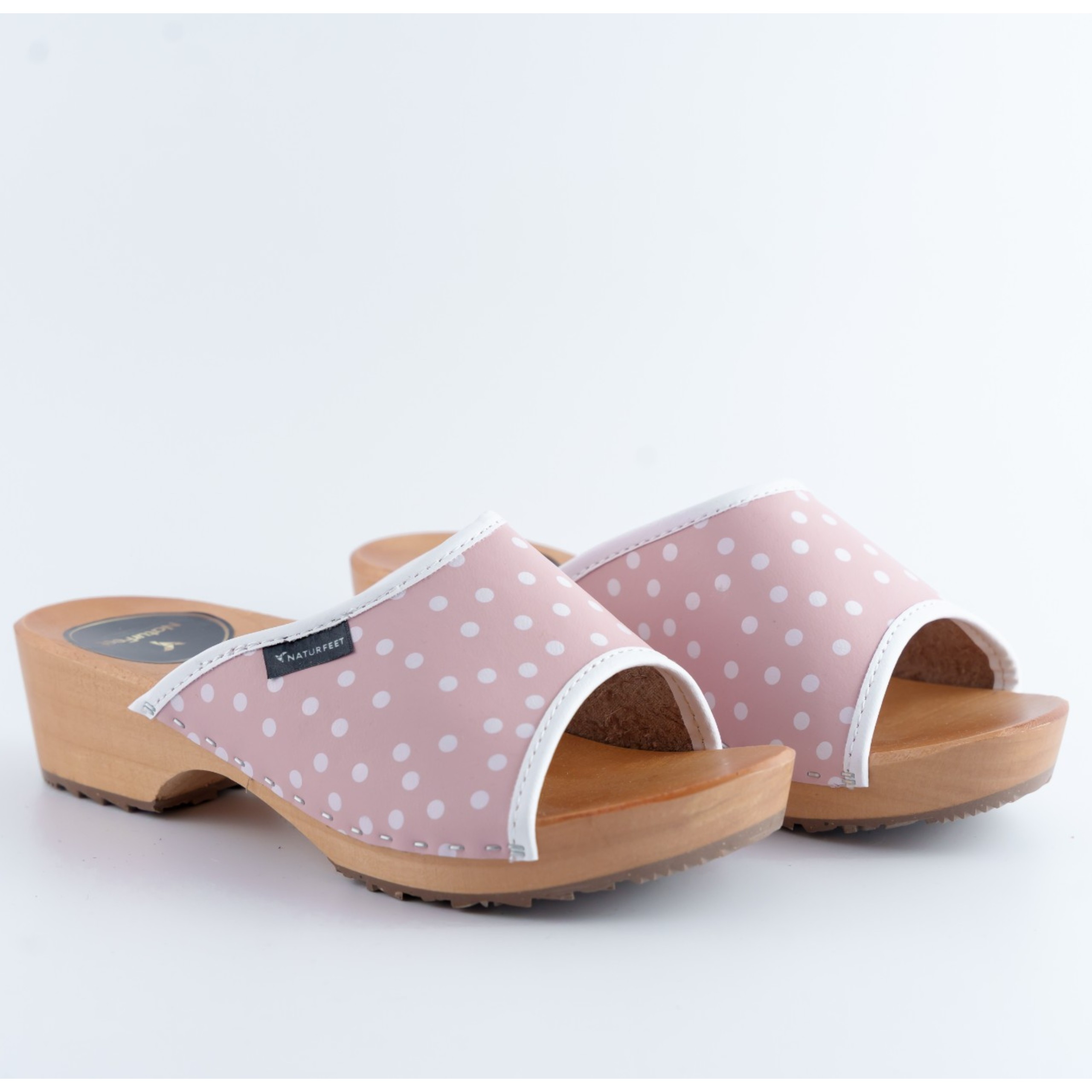 Dodaj odrobinę retro stylu do swojej kolekcji obuwia! Przedstawiamy damskie chodaki marki Naturfeet – ręcznie wykonane z najwyższej jakości naturalnych materiałów. Cholewka z naturalnej skóry w modny różowy wzór w białe grochy sprawia, że te drewniaki są nie tylko wygodne, ale i niezwykle stylowe.