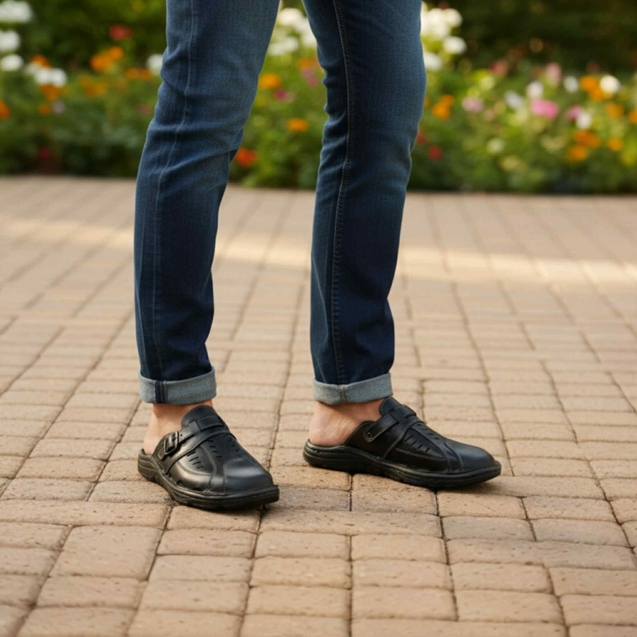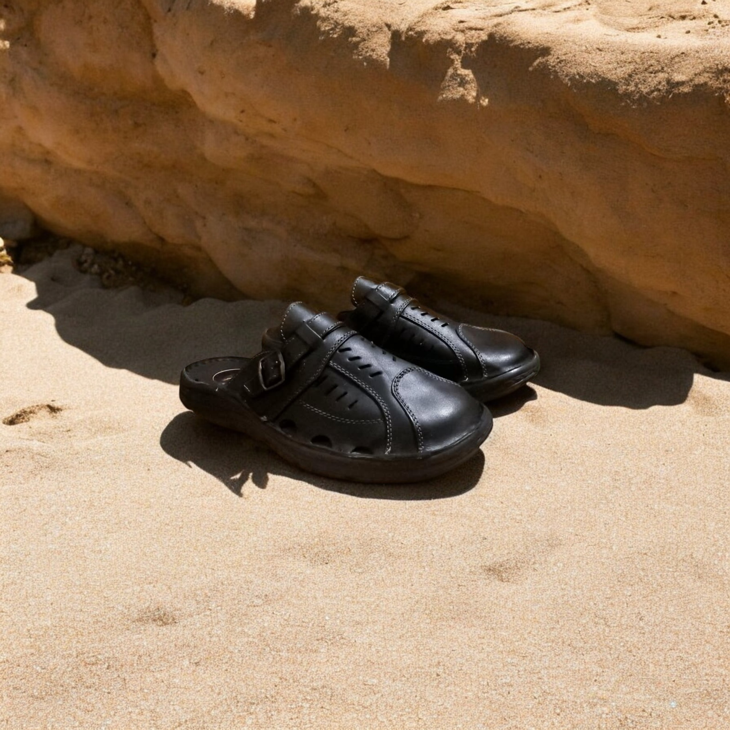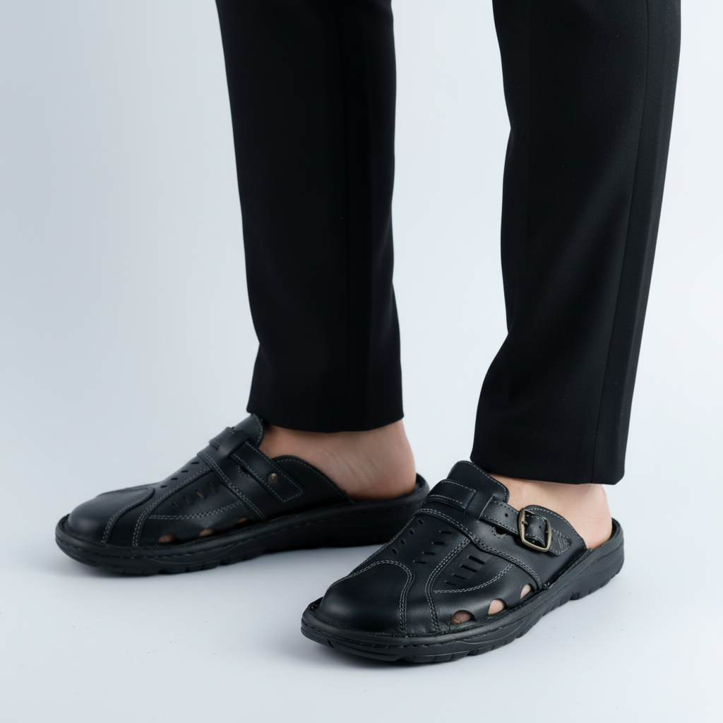 Stylowe i wygodne klapki męskie wykonane z wysokiej jakości skóry naturalnej. Klasyczny, czarny kolor oraz solidne wykonanie sprawiają, że są idealnym wyborem na codzienne użytkowanie, zarówno w domu, jak i na zewnątrz. Regulowane zapięcie na klamrę pozwala dopasować but do stopy, zapewniając komfort noszenia. Antypoślizgowa, elastyczna podeszwa zapewnia stabilność i bezpieczeństwo na różnych nawierzchniach. Idealne połączenie elegancji i funkcjonalności dla każdego mężczyzny ceniącego wygodę i trwałość.