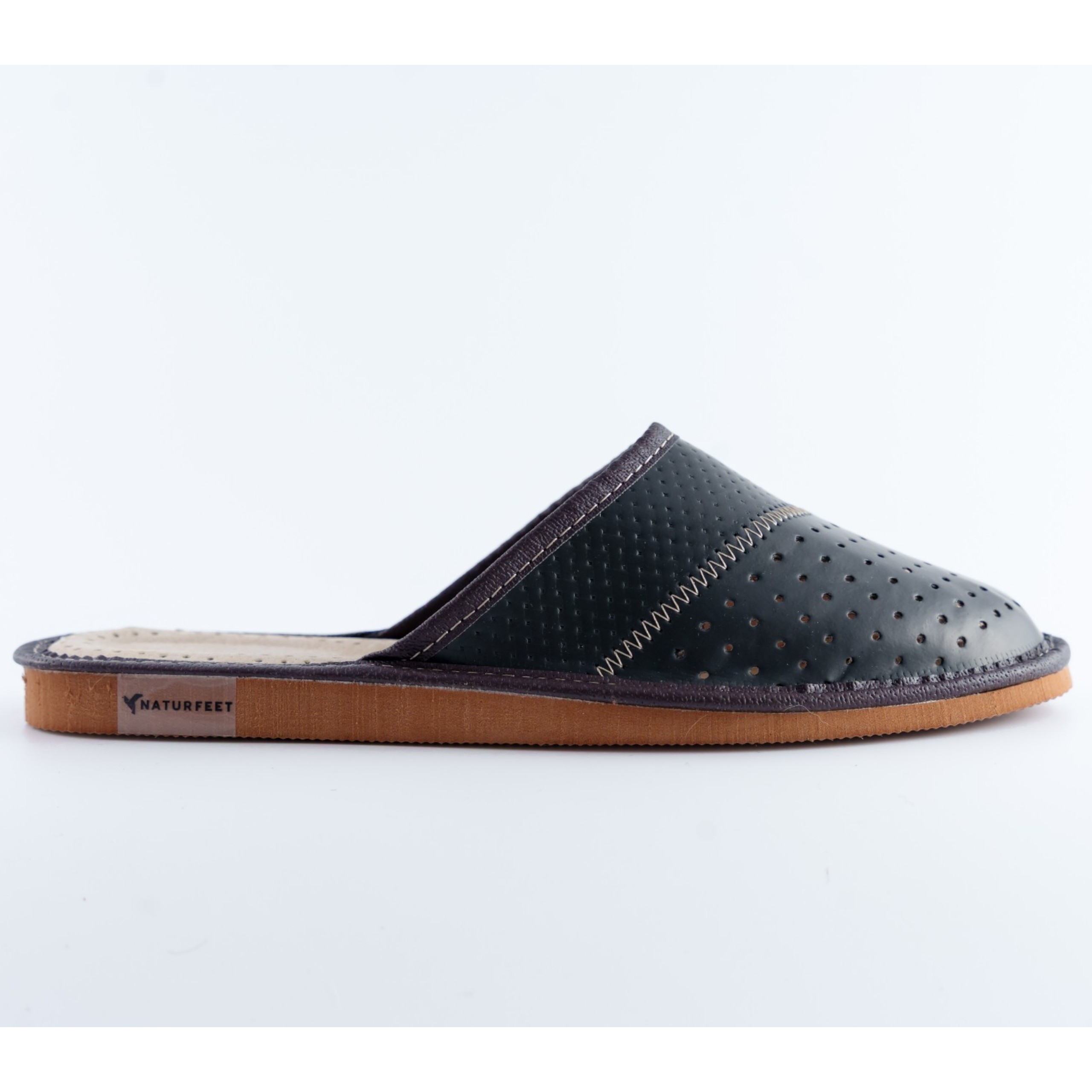 Klasyczne męskie kapcie marki Naturfeet, wykonane z wysokiej jakości powlekanej skóry naturalnej, to doskonałe połączenie elegancji i codziennego komfortu. Liczne perforacje w cholewce zapewniają optymalną wentylację, a solidne wykończenie gwarantuje trwałość na lata.