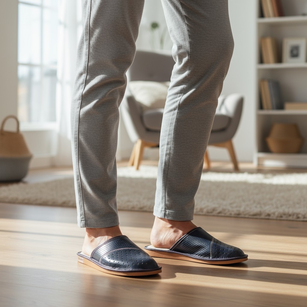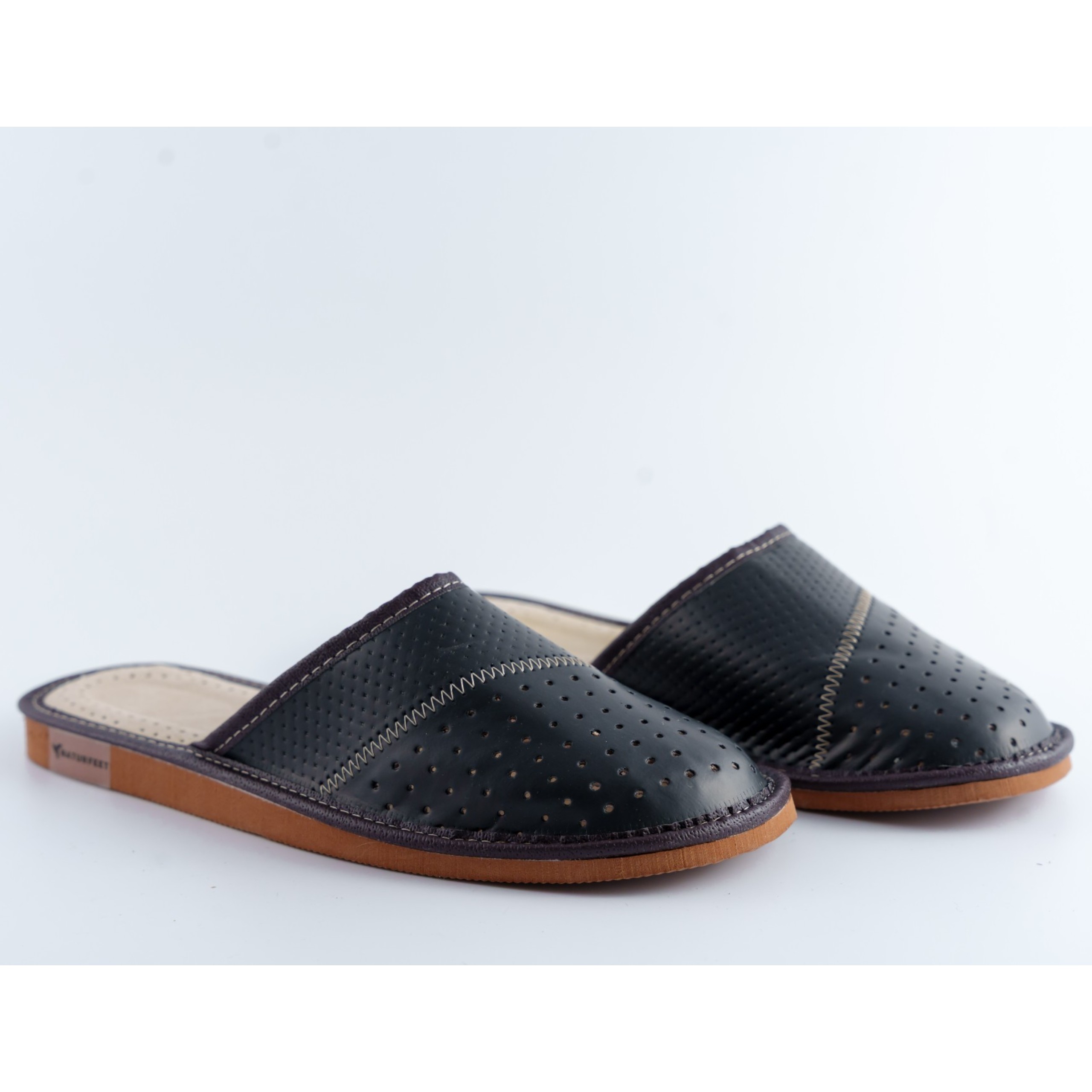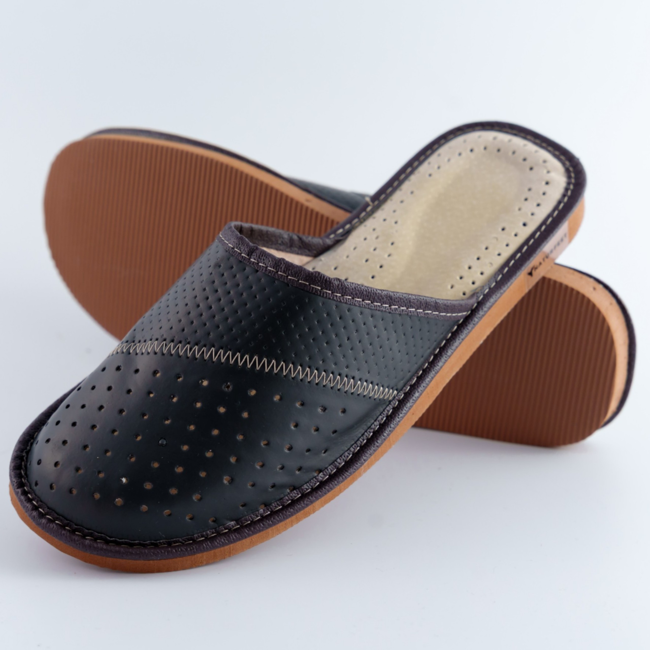 Skórzana wkładka i wnętrze dają uczucie naturalnej świeżości i wygody, natomiast lekka podeszwa z pianki EVA amortyzuje każdy krok, nie obciążając stopy. Idealne do noszenia w domu – zarówno latem, jak i zimą.