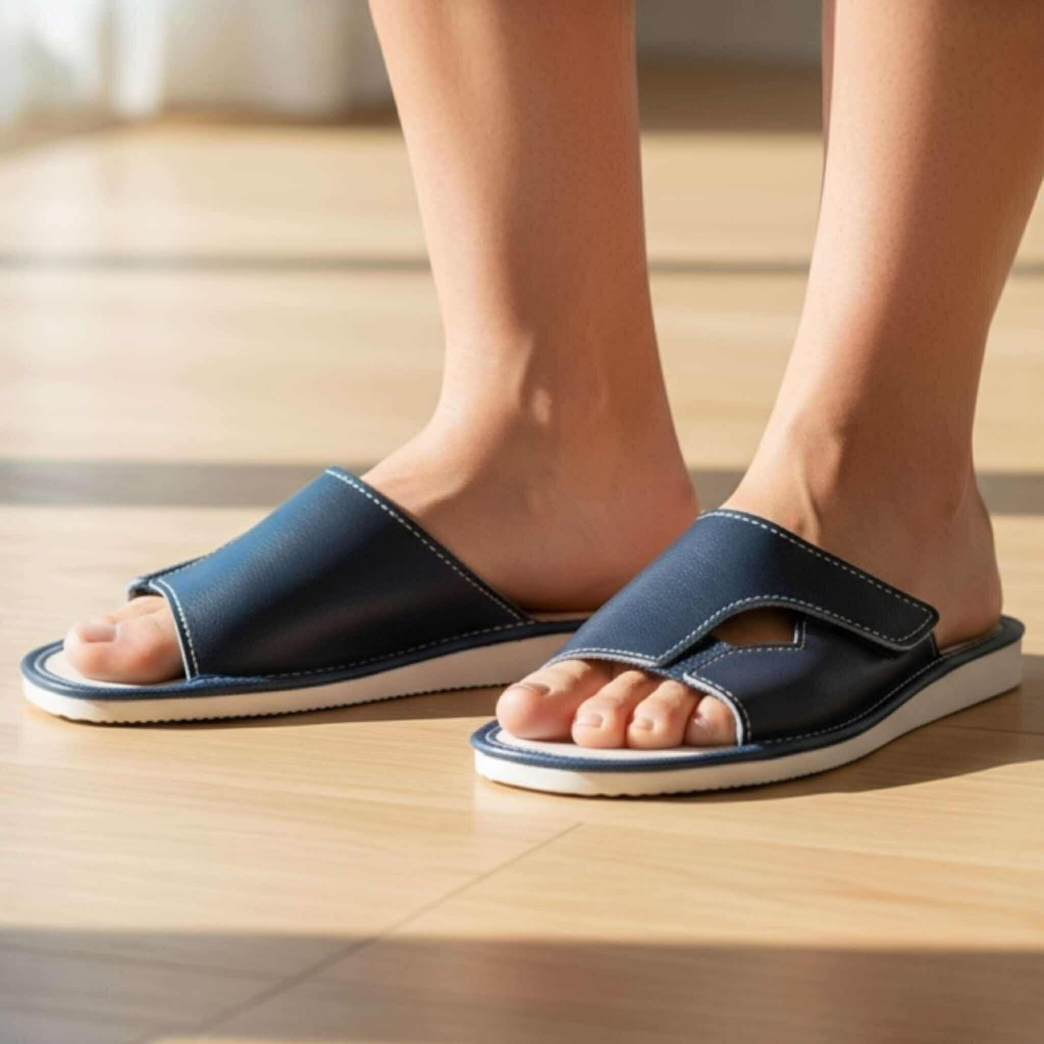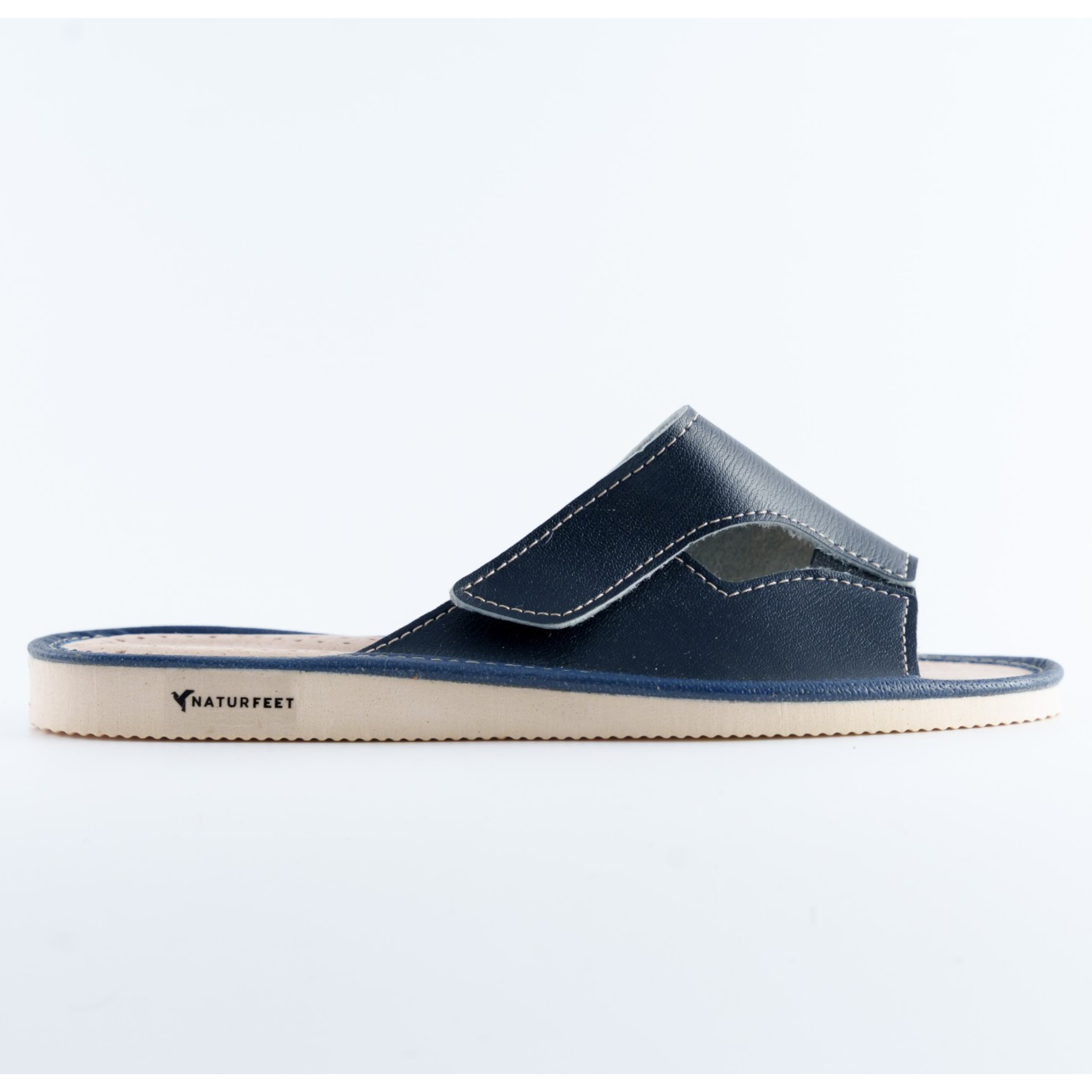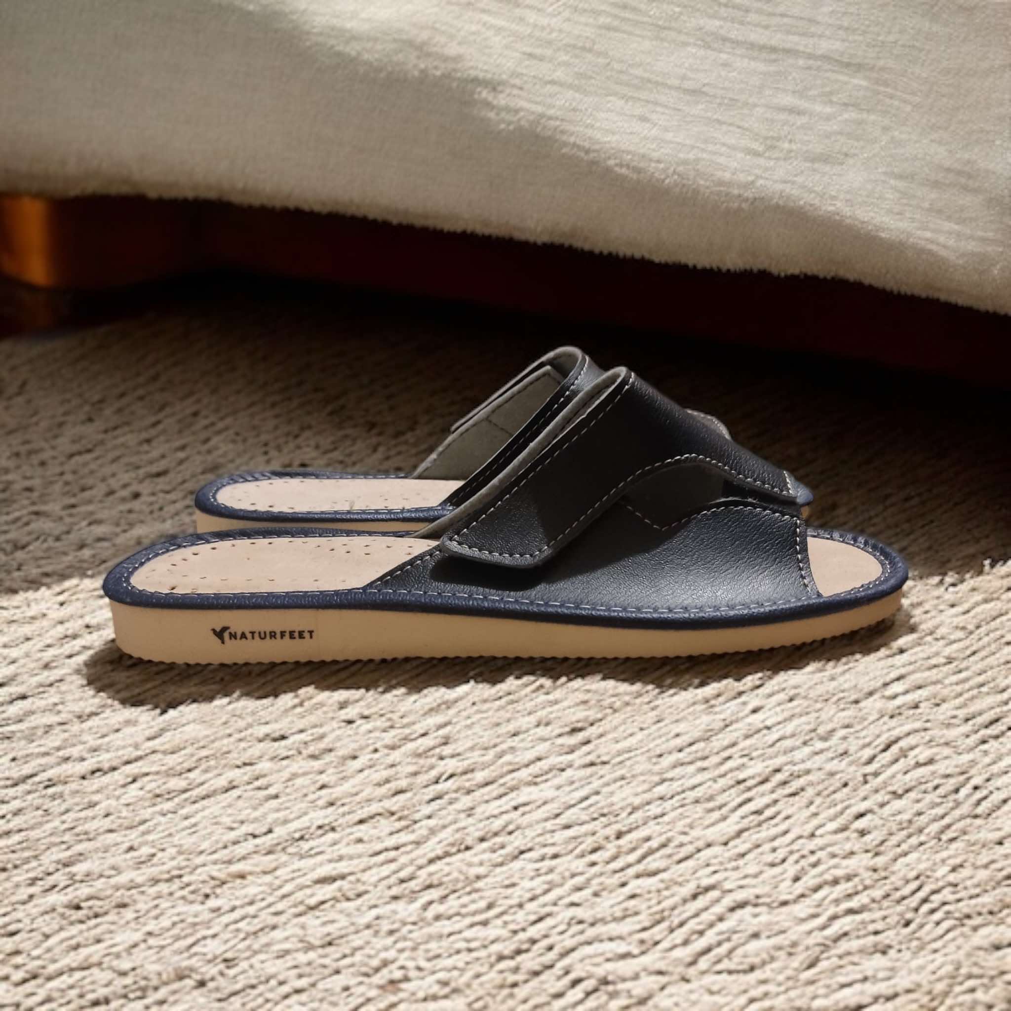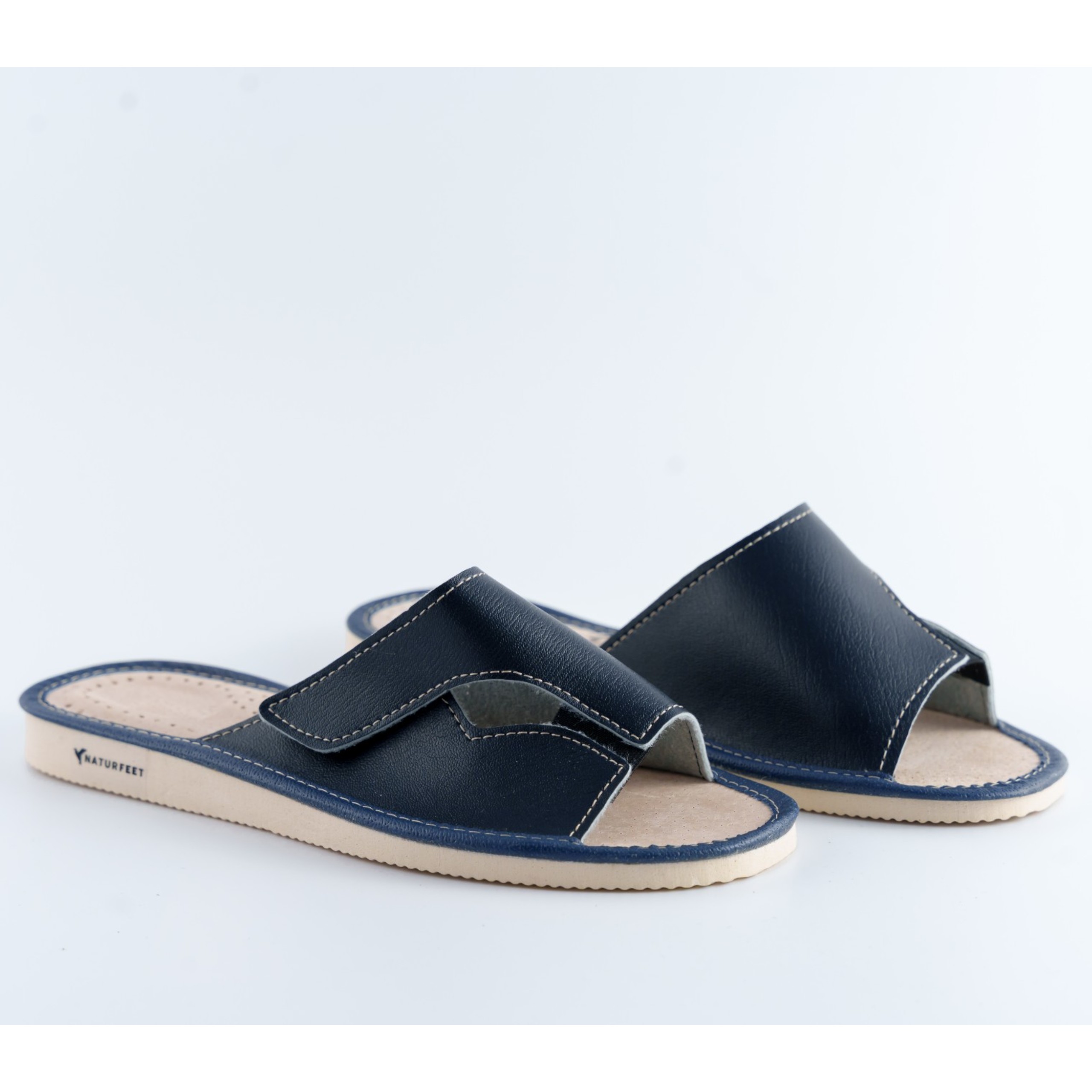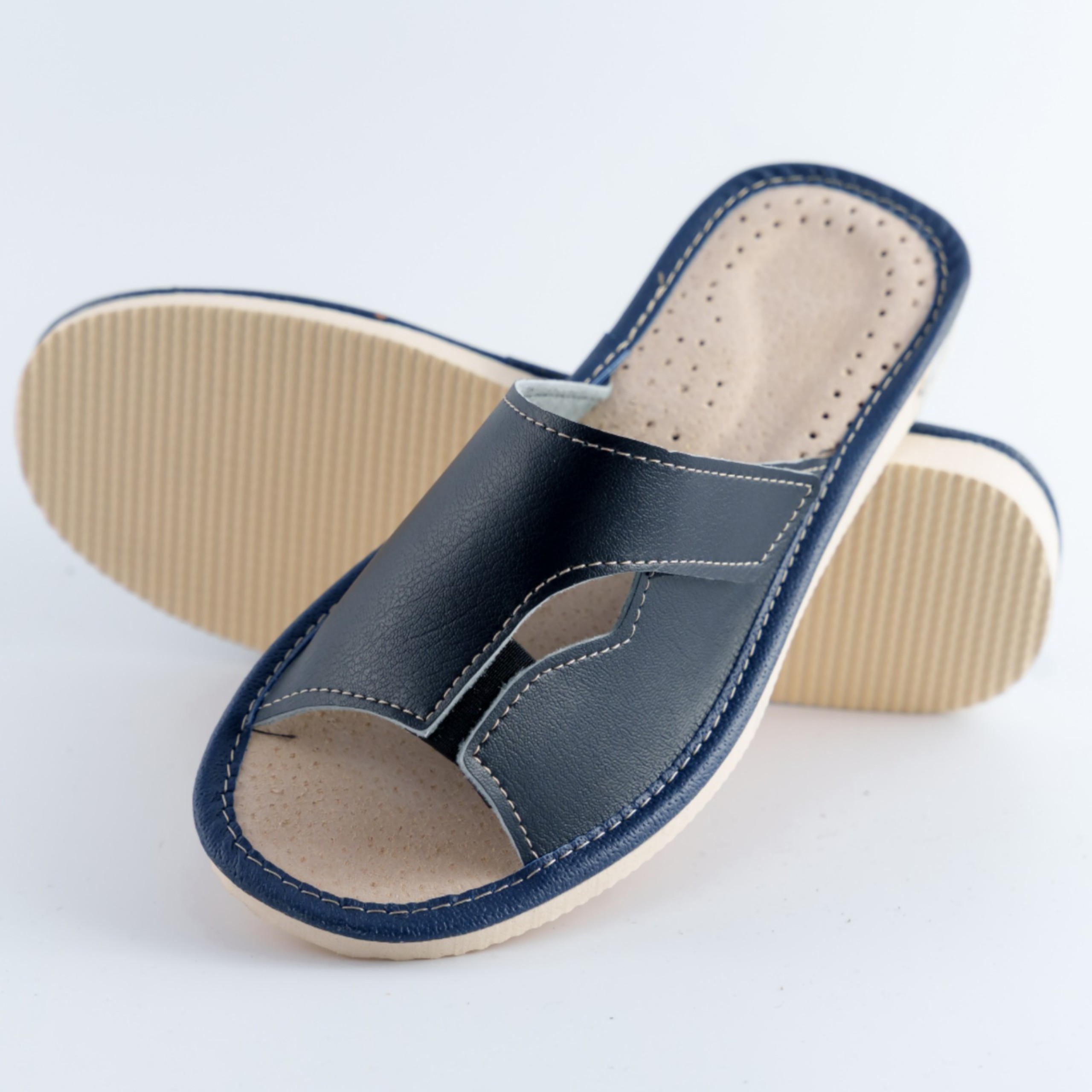 Wierzch wykonany z naturalnej skóry zapewnia trwałość i elegancki wygląd, a miękka, perforowana wkładka gwarantuje odpowiednią cyrkulację powietrza. Antypoślizgowa podeszwa dba o Twoje bezpieczeństwo w domu.