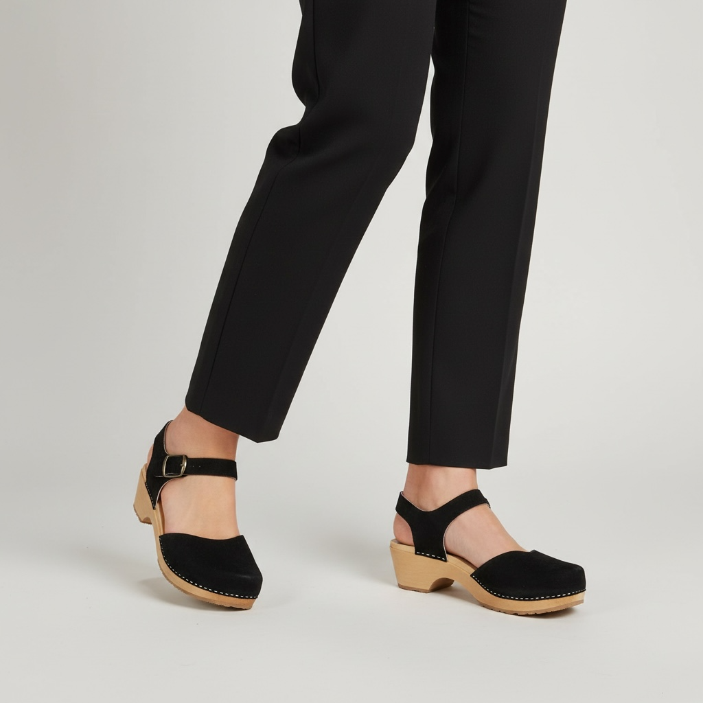 Stylowe chodaki Naturfeet SK8BL zostały wykonane z naturalnej skóry zamszowej w czarnym kolorze. Zabudowany nosek i regulowany pasek pomagają dobrze ustabilizować stopę, a drewniana podeszwa z olchy zapewnia lekkość i naturalną amortyzację podczas chodzenia. To model, który łączy prostą formę z wyrazistym, dopracowanym wykończeniem.